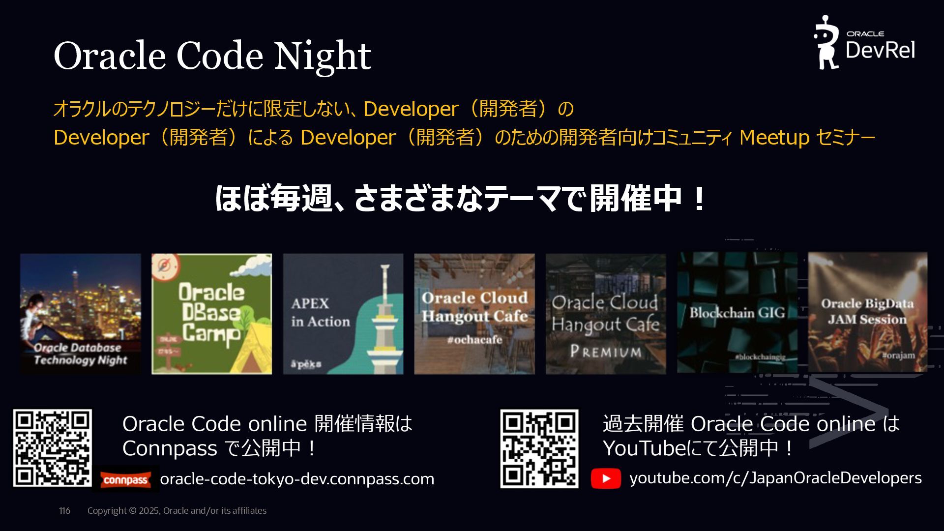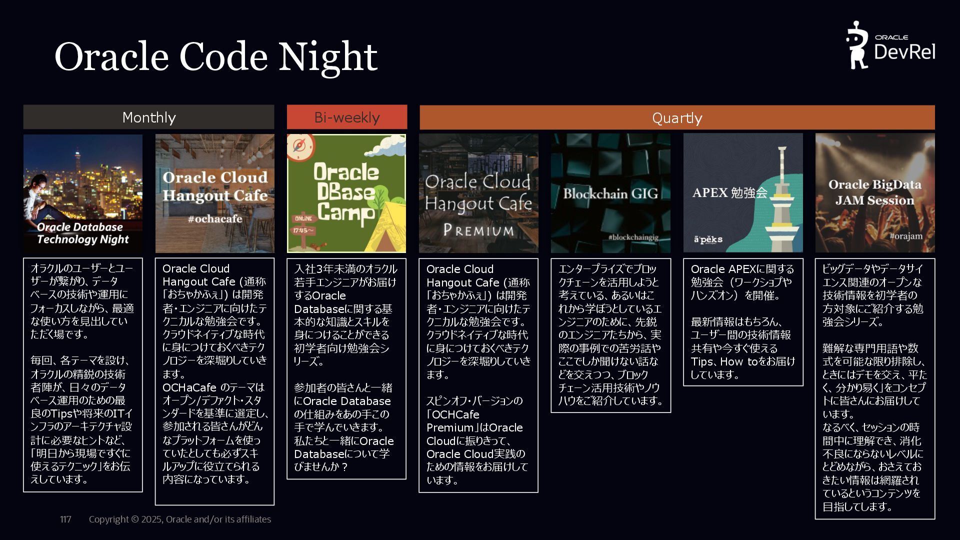 な使い⽅を⾒出してい ただく場です。 毎回、各テーマを設け、 オラクルの精鋭の技術 者陣が、⽇々のデータ ベース運⽤のための最 良のTipsや将来のITイ ンフラのアーキテクチャ設 計に必要なヒントなど、 「明⽇から現場ですぐに 使えるテクニック」をお伝 えしています。 Oracle Cloud Hangout Cafe (通称 「おちゃかふぇ」) は開発 者・エンジニアに向けたテ クニカルな勉強会です。 クラウドネイティブな時代 に⾝につけておくべきテク ノロジーを深堀りしていき ます。 OCHaCafe のテーマは オープン/デファクト・スタ ンダードを基準に選定し、 参加される皆さんがどん なプラットフォームを使っ ていたとしても必ずスキ ルアップに役⽴てられる 内容になっています。 ⼊社3年未満のオラクル 若⼿エンジニアがお届け するOracle Databaseに関する基 本的な知識とスキルを ⾝につけることができる 初学者向け勉強会シ リーズ。 参加者の皆さんと⼀緒 にOracle Database の仕組みをあの⼿この ⼿で学んでいきます。 私たちと⼀緒にOracle Databaseについて学 びませんか︖ エンタープライズでブロッ クチェーンを活⽤しようと 考えている、あるいはこ れから学ぼうとしているエ ンジニアのために、先鋭 のエンジニアたちから、実 際の事例での苦労話や ここでしか聞けない話な どを交えつつ、ブロック チェーン活⽤技術やノウ ハウをご紹介しています。 Oracle APEXに関する 勉強会(ワークショプや ハンズオン)を開催。 最新情報はもちろん、 ユーザー間の技術情報 共有や今すぐ使える Tips、How toをお届け しています。 ビッグデータやデータサイ エンス関連のオープンな 技術情報を初学者の ⽅対象にご紹介する勉 強会シリーズ。 難解な専⾨⽤語や数 式を可能な限り排除し、 ときにはデモを交え、平た く、分かり易く」をコンセプ トに皆さんにお届けして います。 なるべく、セッションの時 間中に理解でき、消化 不良にならないレベルに とどめながら、おさえてお きたい情報は網羅され ているというコンテンツを ⽬指してします。 Oracle Cloud Hangout Cafe (通称 「おちゃかふぇ」) は開発 者・エンジニアに向けたテ クニカルな勉強会です。 クラウドネイティブな時代 に⾝につけておくべきテク ノロジーを深堀りしていき ます。 スピンオフ・バージョンの 「OCHCafe Premium」はOracle Cloudに振りきって、 Oracle Cloud実践の ための情報をお届けして います。 Copyright © 2025, Oracle and/or its affiliates 117