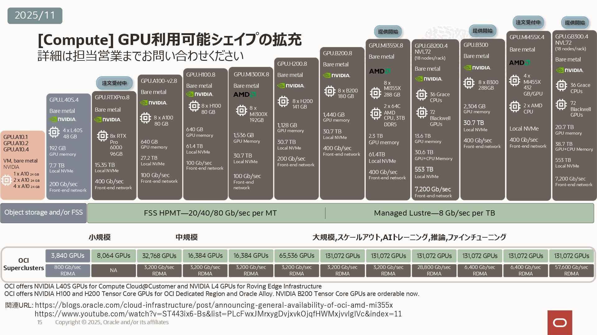 Gb/sec RDMA 16,384 GPUs 3,200 Gb/sec RDMA 65,536 GPUs 3,200 Gb/sec RDMA 8,064 GPUs NA 131,072 GPUs 3,200 Gb/sec RDMA 131,072 GPUs 28,800 Gb/sec RDMA GPU.A10.1 GPU.A10.2 GPU.A10.4 VM, bare metal NVIDIA 1 x A10 24 GB 2 x A10 24 GB 4 x A10 24 GB GPU.GB200.4 NVL72 (18 nodes/rack) Bare metal 36 Grace CPUs 72 Blackwell GPUs 13.6 TB GPU memory 30.6 TB GPU+CPU Memory 553 TB Local NVMe 7,200 Gb/sec Front-end network GPU.H200.8 Bare metal 8 x H200 141 GB 1,128 GB GPU memory 30.7 TB Local NVMe 200 Gb/sec Front-end network GPU.H100.8 Bare metal 8 x H100 80 GB 640 GB GPU memory 61.4 TB Local NVMe 100 Gb/sec Front-end network GPU.A100-v2.8 Bare metal 8 x A100 80 GB 640 GB GPU memory 27.2 TB Local NVMe 100 Gb/sec Front-end network GPU.L40S.4 Bare metal 4 x L40S 48 GB 192 GB GPU memory 7.7 TB Local NVMe 200 Gb/sec Front-end network ⼤規模,スケールアウト,AIトレーニング,推論,ファインチューニング 中規模 ⼩規模 Object storage and/or FSS FSS HPMT—20/40/80 Gb/sec per MT Managed Lustre—8 Gb/sec per TB GPU.GB300.4 NVL72 (18 nodes/rack) Bare metal 36 Grace CPUs 72 Blackwell GPUs 20.7 TB GPU memory 38.7 TB GPU+CPU Memory 553 TB Local NVMe 7,200 Gb/sec Front-end network 3,840 GPUs 800 Gb/sec RDMA Bare metal 8 x MI300X 192GB GPU.MI300X.8 1,536 GB GPU Memory 30.7 TB Local NVMe 100 Gb/sec Front-end network 131,072 GPUs 6,400 Gb/sec RDMA GPU.RTXPro.8 Bare metal 8x RTX Pro 6000 96GB 15.35 TB Local NVMe 400 Gb/sec Front-end network 16,384 GPUs 131,072 GPUs 6,400 Gb/sec RDMA OCI Superclusters GPU.MI355X.8 Bare metal 8 x MI355X 288 GB 2 x 64C AMD CPU, 3TB DDR5 2.3 TB GPU memory 61.4TB Local NVMe 400 Gb/sec Front-end network 提供開始 131,072 GPUs 3,200 Gb/sec RDMA 131,072 GPUs 57,600 Gb/sec RDMA GPU.B200.8 Bare metal 8 x B200 180 GB 1,440 GB GPU memory 30.7 TB Local NVMe 400 Gb/sec Front-end network 注⽂受付中 GPU.B300 Bare metal 8 x B300 288GB 2,304 GB GPU memory 30.7 TB Local NVMe 400 Gb/sec Front-end network 提供開始 提供開始 GPU.MI455X.4 Bare metal 4 x MI455X 432 GB/GPU 2 x AMD CPU Local NVMe 400 Gb/sec Front-end network 注⽂受付中 OCI offers NVIDIA L40S GPUs for Compute Cloud@Customer and NVIDIA L4 GPUs for Roving Edge Infrastructure OCI offers NVIDIA H100 and H200 Tensor Core GPUs for OCI Dedicated Region and Oracle Alloy. NVIDIA B200 Tensor Core GPUs are orderable now. 関連URL: https://blogs.oracle.com/cloud-infrastructure/post/announcing-general-availability-of-oci-amd-mi355x https://www.youtube.com/watch?v=ST443ix6-Bs&list=PLcFwxJMrxygDvjxvkOjqfHWMxjvvIglVc&index=11 Copyright © 2025, Oracle and/or its affiliates 15