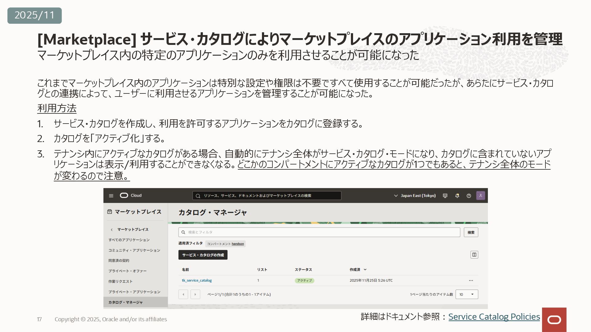 テナンシ内にアクティブなカタログがある場合、⾃動的にテナンシ全体がサービス・カタログ・モードになり、カタログに含まれていないアプ リケーションは表⽰/利⽤することができなくなる。どこかのコンパートメントにアクティブなカタログが1つでもあると、テナンシ全体のモード が変わるので注意。 マーケットプレイス内の特定のアプリケーションのみを利⽤させることが可能になった 2025/11 詳細はドキュメント参照︓Service Catalog Policies Copyright © 2025, Oracle and/or its affiliates 17