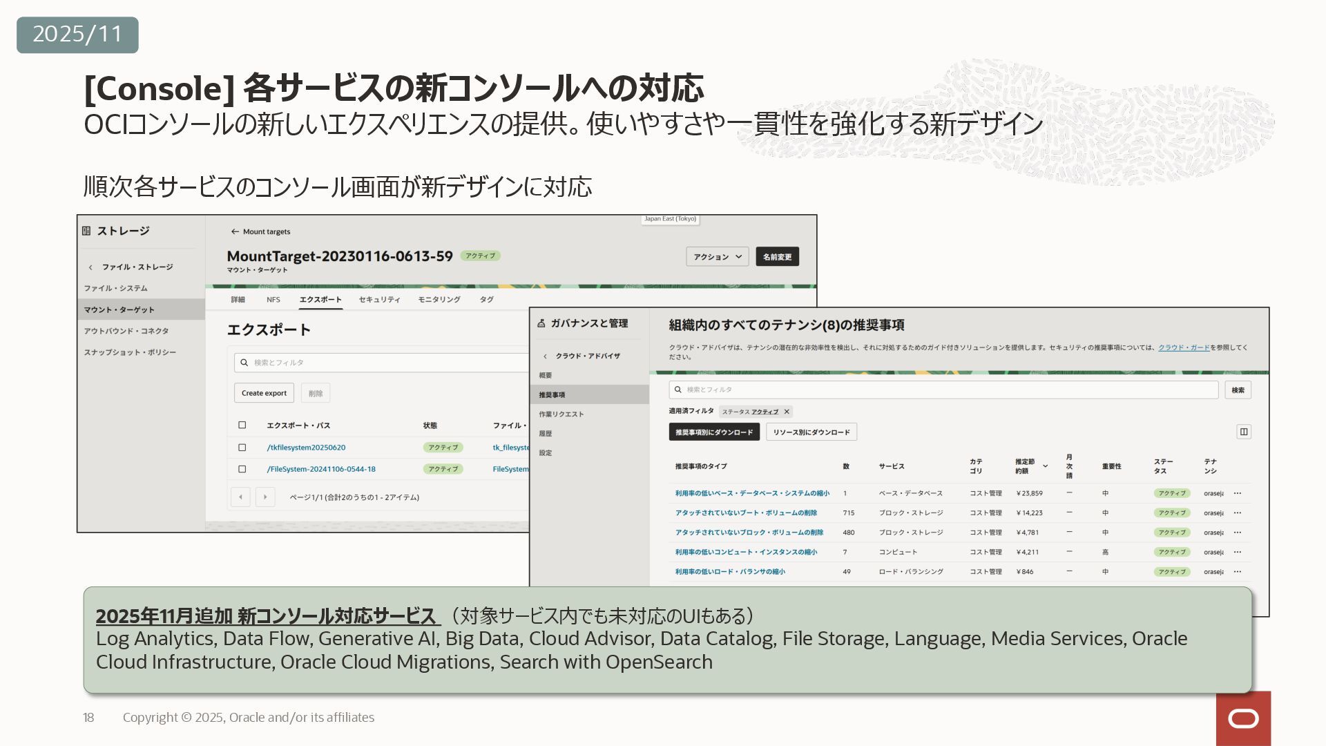 17. [Audit] コンソールの「監査」ページの廃⽌ 2025年12⽉以降、コンソールの「監査」ページは廃⽌される予定。ただし、AuditのAPI/SDK/CLIは引き続き利⽤可能。 今後コンソールで監査ログを表⽰するためには、ロギング・サービスの監査ログのUIを利⽤すること。 https://docs.oracle.com/ja-jp/iaas/Content/Logging/Concepts/audit_logs.htm 24 Copyright © 2025, Oracle
