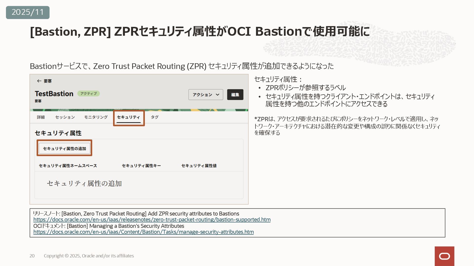 2025/11 リリースノート: [Bastion, Zero Trust Packet Routing] Add ZPR security attributes to Bastions https://docs.oracle.com/en-us/iaas/releasenotes/zero-trust-packet-routing/bastion-supported.htm OCIドキュメント: [Bastion] Managing a Bastion's Security Attributes https://docs.oracle.com/en-us/iaas/Content/Bastion/Tasks/manage-security-attributes.htm セキュリティ属性︓ • ZPRポリシーが参照するラベル • セキュリティ属性を持つクライアント・エンドポイントは、セキュリティ 属性を持つ他のエンドポイントにアクセスできる *ZPRは、アクセスが要求されるたびにポリシーをネットワーク・レベルで適⽤し、ネッ トワーク・アーキテクチャにおける潜在的な変更や構成の誤りに関係なくセキュリティ を確保する Copyright © 2025, Oracle and/or its affiliates 20