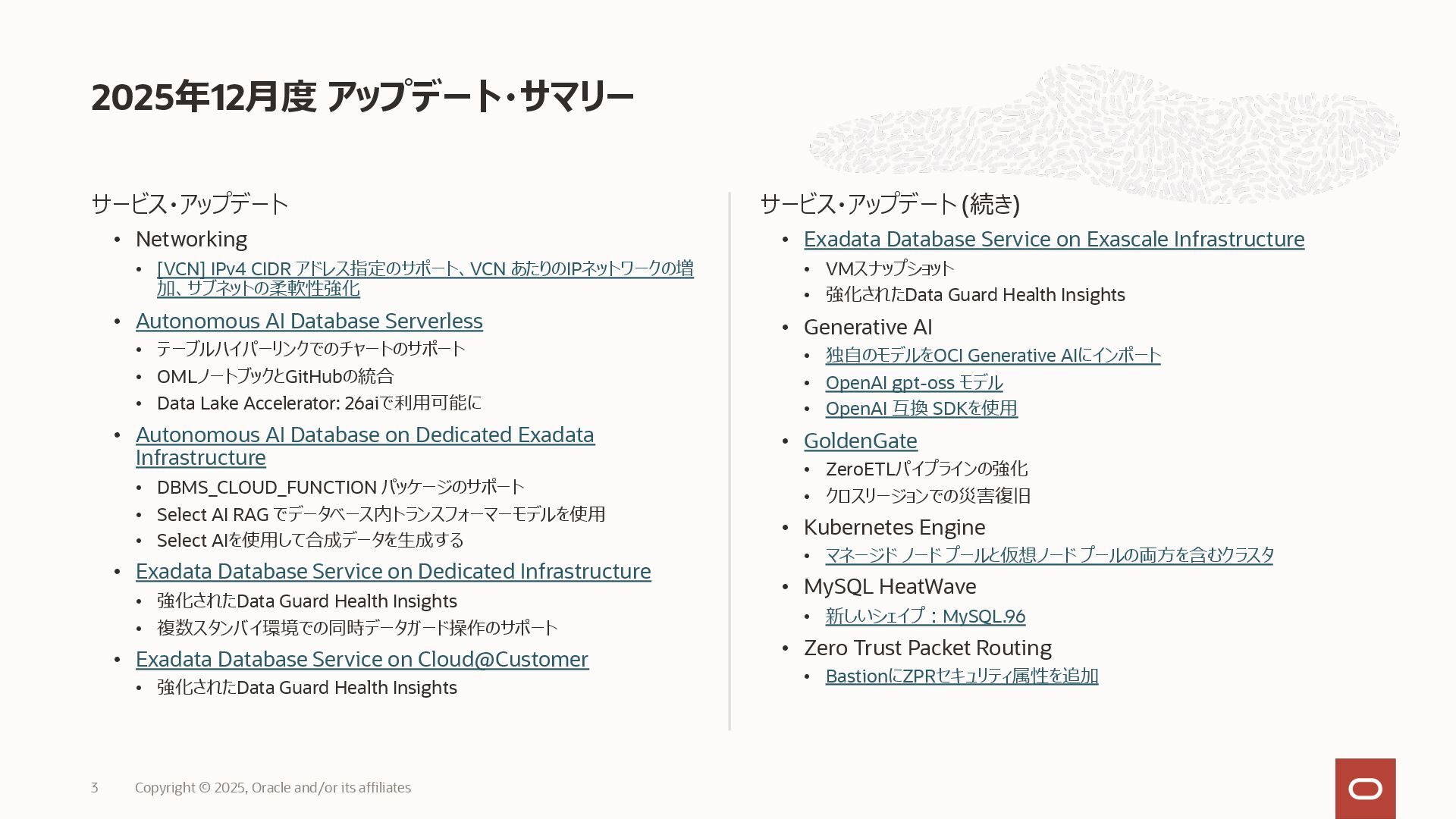 Infrastructure ドキュメント (⽇本語版)︓Infrastructure|Platform リリースノート • Oracle Cloud Infrastructure > Release Notes • Oracle Cloud Infrastructure > リリースノート (⽇ 本語版) ブログ • [英語]Oracle Cloud Infrastructure Blog • [英語]Oracle Database Insider • [⽇本語]オラクルエンジニア通信 • サービス・アップデート(全体概要) • 本資料の過去資料はこちら 各サービスのアップデートはこちらから確認できます Copyright © 2025, Oracle and/or its affiliates 2