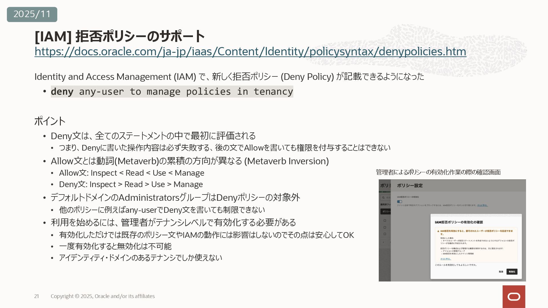 が記載できるようになった • deny any-user to manage policies in tenancy ポイント • Deny⽂は、全てのステートメントの中で最初に評価される • つまり、Denyに書いた操作内容は必ず失敗する、後の⽂でAllowを書いても権限を付与することはできない • Allow⽂とは動詞(Metaverb)の累積の⽅向が異なる (Metaverb Inversion) • Allow⽂: Inspect < Read < Use < Manage • Deny⽂: Inspect > Read > Use > Manage • デフォルトドメインのAdministratorsグループはDenyポリシーの対象外 • 他のポリシーに例えばany-userでDeny⽂を書いても制限できない • 利⽤を始めるには、管理者がテナンシレベルで有効化する必要がある • 有効化しただけでは既存のポリシー⽂やIAMの動作には影響はしないのでその点は安⼼してOK • ⼀度有効化すると無効化は不可能 • アイデンティティ・ドメインのあるテナンシでしか使えない https://docs.oracle.com/ja-jp/iaas/Content/Identity/policysyntax/denypolicies.htm 2025/11 管理者によるポリシーの有効化作業の際の確認画⾯ Copyright © 2025, Oracle and/or its affiliates 21