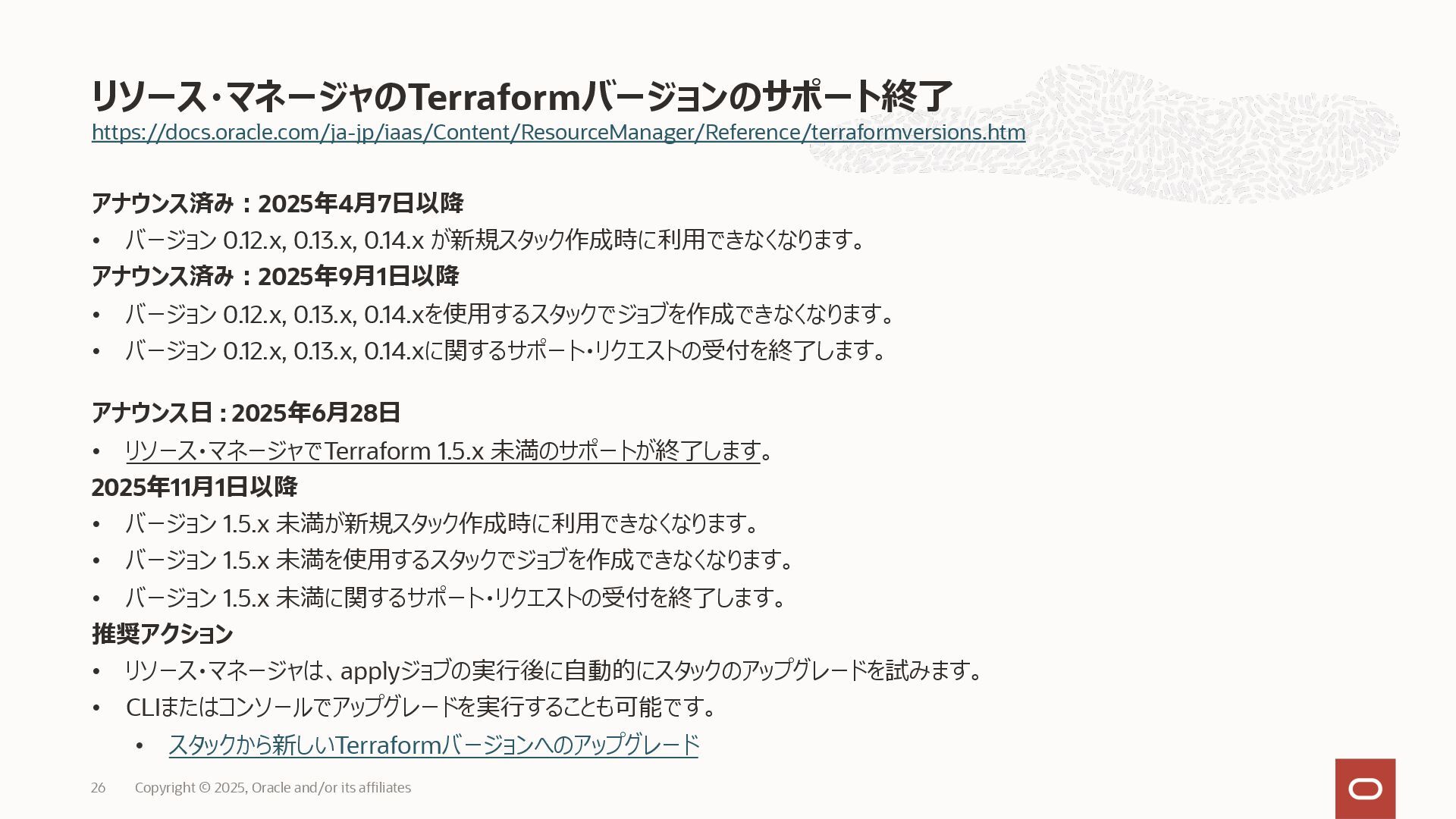 バージョン 0.12.x, 0.13.x, 0.14.xを使⽤するスタックでジョブを作成できなくなります。 • バージョン 0.12.x, 0.13.x, 0.14.xに関するサポート・リクエストの受付を終了します。 アナウンス⽇ : 2025年6⽉28⽇ • リソース・マネージャでTerraform 1.5.x 未満のサポートが終了します。 2025年11⽉1⽇以降 • バージョン 1.5.x 未満が新規スタック作成時に利⽤できなくなります。 • バージョン 1.5.x 未満を使⽤するスタックでジョブを作成できなくなります。 • バージョン 1.5.x 未満に関するサポート・リクエストの受付を終了します。 推奨アクション • リソース・マネージャは、applyジョブの実⾏後に⾃動的にスタックのアップグレードを試みます。 • CLIまたはコンソールでアップグレードを実⾏することも可能です。 • スタックから新しいTerraformバージョンへのアップグレード リソース・マネージャのTerraformバージョンのサポート終了 Copyright © 2025, Oracle and/or its affiliates 26