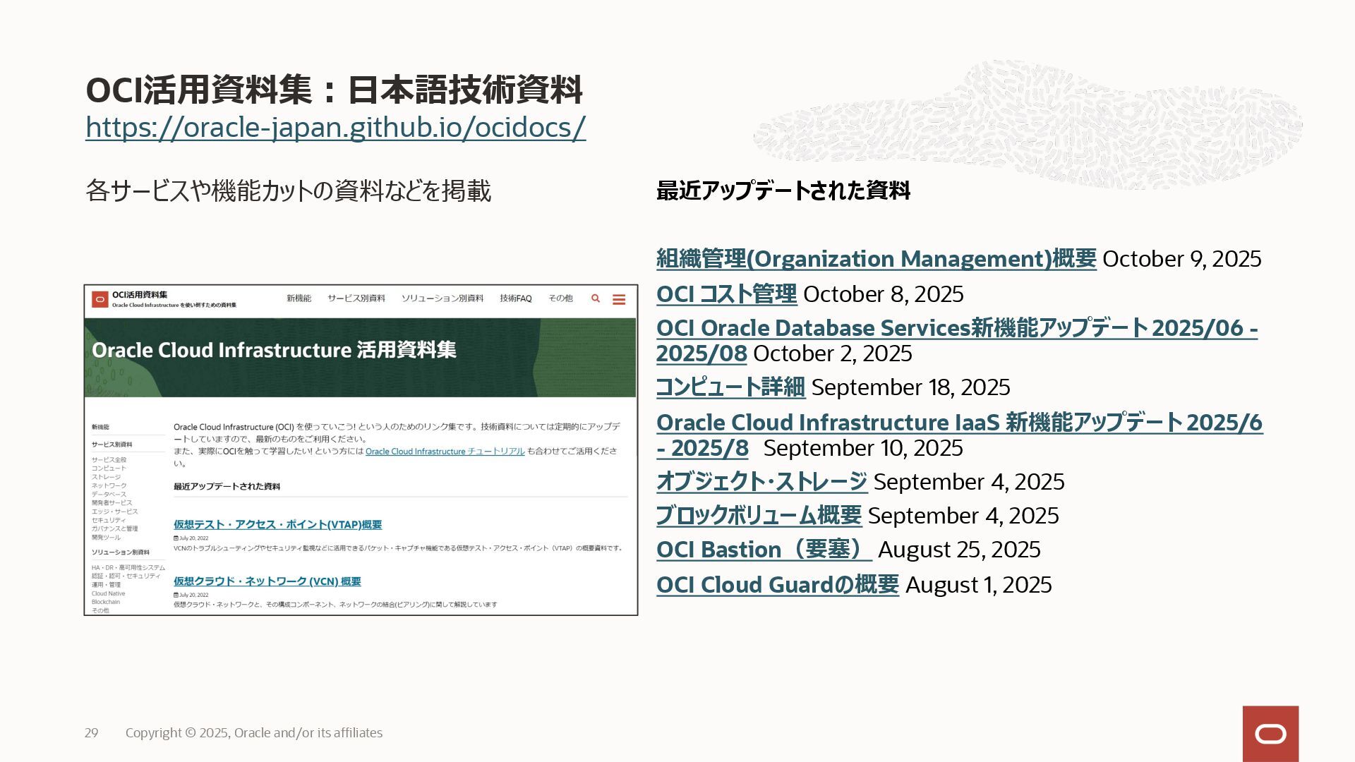 21. https://oracle-japan.github.io/ocidocs/ 各サービスや機能カットの資料などを掲載 OCI活⽤資料集︓⽇本語技術資料 Copyright © 2025, Oracle and/or its affiliates