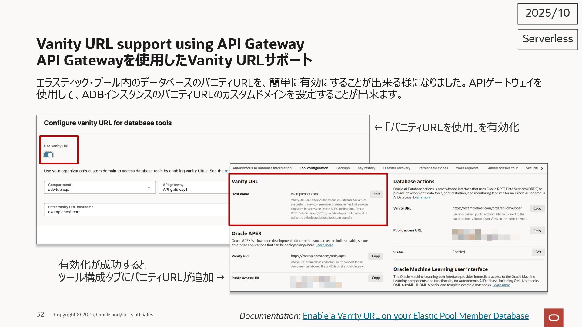 23. 32 Copyright © 2025, Oracle and/or its affiliates エラスティック・プール内のデータベースのバニティURLを、簡単に有効にすることが出来る様になりました。APIゲートウェイを 使⽤して、ADBインスタンスのバニティURLのカスタムドメインを設定することが出来ます。
