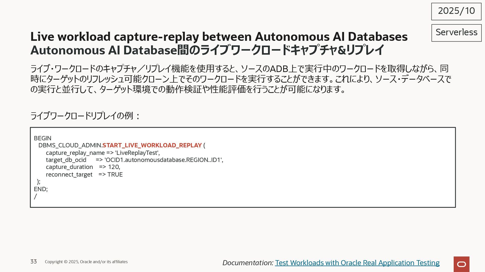 の実⾏と並⾏して、ターゲット環境での動作検証や性能評価を⾏うことが可能になります。 ライブワークロードリプレイの例︓ Documentation: Test Workloads with Oracle Real Application Testing Live workload capture-replay between Autonomous AI Databases Autonomous AI Database間のライブワークロードキャプチャ&リプレイ 2025/10 Serverless BEGIN DBMS_CLOUD_ADMIN.START_LIVE_WORKLOAD_REPLAY ( capture_replay_name => 'LiveReplayTest', target_db_ocid => 'OCID1.autonomousdatabase.REGION..ID1', capture_duration => 120, reconnect_target => TRUE ); END; /