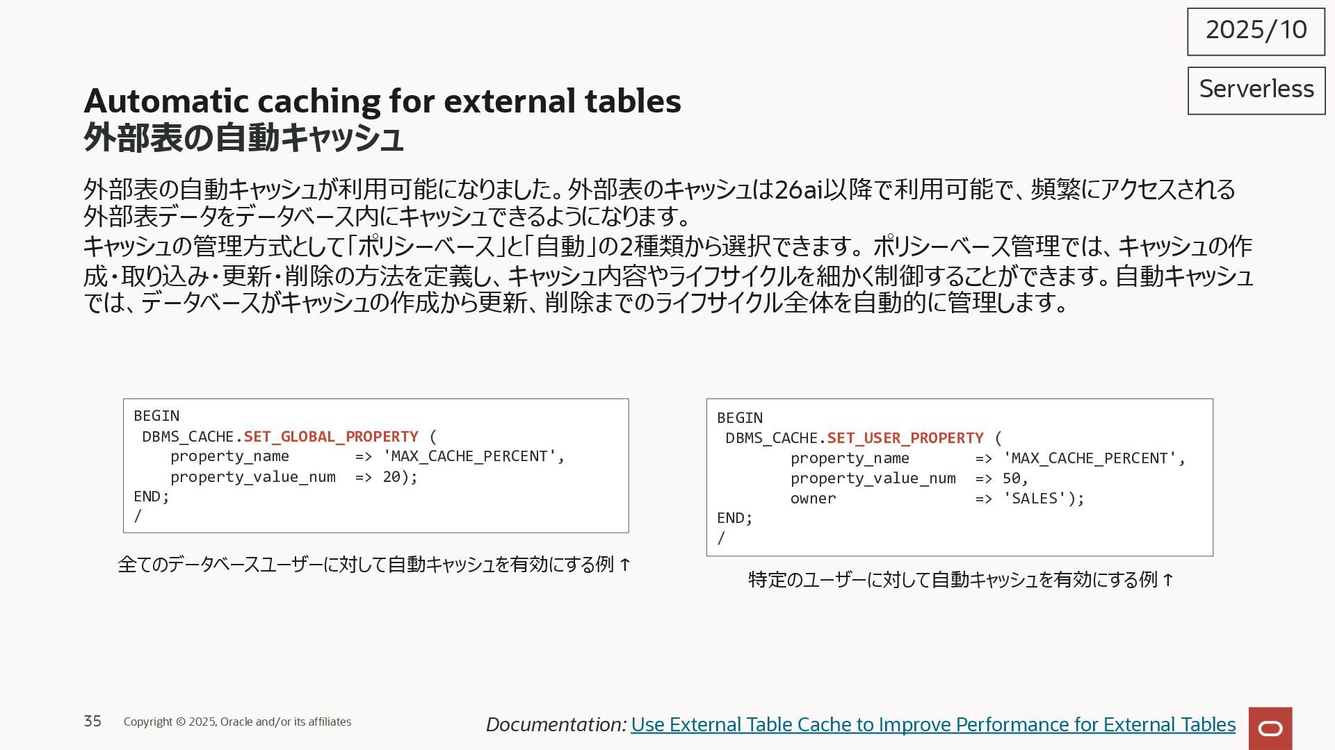 キャッシュの管理⽅式として「ポリシーベース」と「⾃動」の2種類から選択できます。 ポリシーベース管理では、キャッシュの作 成・取り込み・更新・削除の⽅法を定義し、キャッシュ内容やライフサイクルを細かく制御することができます。⾃動キャッシュ では、データベースがキャッシュの作成から更新、削除までのライフサイクル全体を⾃動的に管理します。 Documentation: Use External Table Cache to Improve Performance for External Tables Automatic caching for external tables 外部表の⾃動キャッシュ 2025/10 Serverless BEGIN DBMS_CACHE.SET_GLOBAL_PROPERTY ( property_name => 'MAX_CACHE_PERCENT', property_value_num => 20); END; / BEGIN DBMS_CACHE.SET_USER_PROPERTY ( property_name => 'MAX_CACHE_PERCENT', property_value_num => 50, owner => 'SALES'); END; / 全てのデータベースユーザーに対して⾃動キャッシュを有効にする例 ↑ 特定のユーザーに対して⾃動キャッシュを有効にする例 ↑