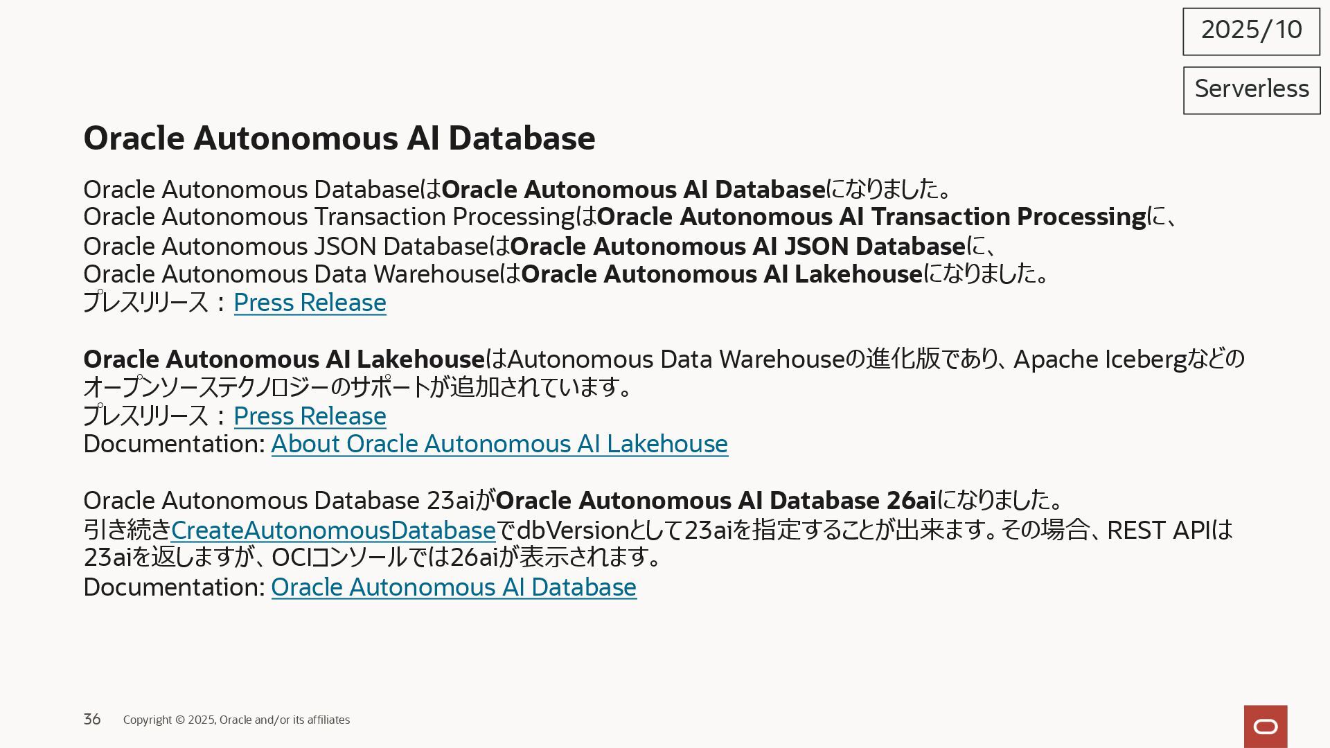 DatabaseはOracle Autonomous AI Databaseになりました。 Oracle Autonomous Transaction ProcessingはOracle Autonomous AI Transaction Processingに、 Oracle Autonomous JSON DatabaseはOracle Autonomous AI JSON Databaseに、 Oracle Autonomous Data WarehouseはOracle Autonomous AI Lakehouseになりました。 プレスリリース︓Press Release Oracle Autonomous AI LakehouseはAutonomous Data Warehouseの進化版であり、Apache Icebergなどの オープンソーステクノロジーのサポートが追加されています。 プレスリリース︓Press Release Documentation: About Oracle Autonomous AI Lakehouse Oracle Autonomous Database 23aiがOracle Autonomous AI Database 26aiになりました。 引き続きCreateAutonomousDatabaseでdbVersionとして23aiを指定することが出来ます。その場合、REST APIは 23aiを返しますが、OCIコンソールでは26aiが表⽰されます。 Documentation: Oracle Autonomous AI Database Oracle Autonomous AI Database 2025/10 Serverless