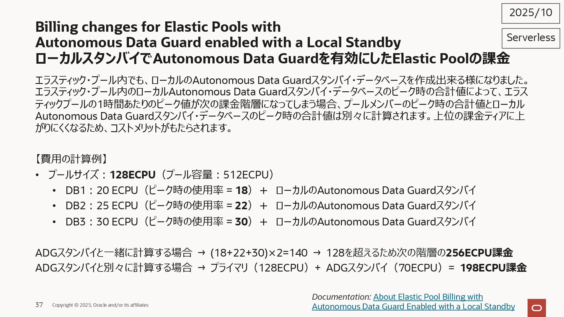 Guardスタンバイ・データベースを作成出来る様になりました。 エラスティック・プール内のローカルAutonomous Data Guardスタンバイ・データベースのピーク時の合計値によって、エラス ティックプールの1時間あたりのピーク値が次の課⾦階層になってしまう場合、プールメンバーのピーク時の合計値とローカル Autonomous Data Guardスタンバイ・データベースのピーク時の合計値は別々に計算されます。上位の課⾦ティアに上 がりにくくなるため、コストメリットがもたらされます。 【費⽤の計算例】 • プールサイズ︓128ECPU(プール容量︓512ECPU) • DB1︓20 ECPU(ピーク時の使⽤率 = 18)+ ローカルのAutonomous Data Guardスタンバイ • DB2︓25 ECPU(ピーク時の使⽤率 = 22)+ ローカルのAutonomous Data Guardスタンバイ • DB3︓30 ECPU(ピーク時の使⽤率 = 30)+ ローカルのAutonomous Data Guardスタンバイ ADGスタンバイと⼀緒に計算する場合 → (18+22+30)×2=140 → 128を超えるため次の階層の256ECPU課⾦ ADGスタンバイと別々に計算する場合 → プライマリ(128ECPU)+ ADGスタンバイ(70ECPU)= 198ECPU課⾦ Documentation: About Elastic Pool Billing with Autonomous Data Guard Enabled with a Local Standby Billing changes for Elastic Pools with Autonomous Data Guard enabled with a Local Standby ローカルスタンバイでAutonomous Data Guardを有効にしたElastic Poolの課⾦ 2025/10 Serverless