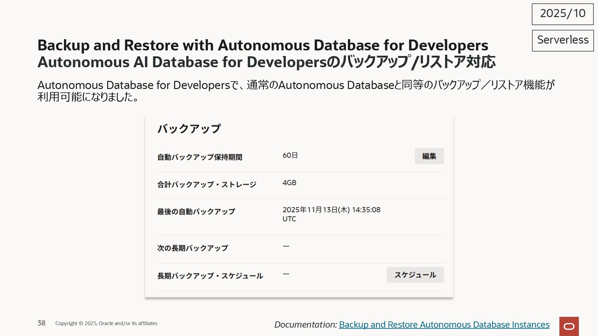 for Developersで、通常のAutonomous Databaseと同等のバックアップ/リストア機能が 利⽤可能になりました。 Documentation: Backup and Restore Autonomous Database Instances Backup and Restore with Autonomous Database for Developers Autonomous AI Database for Developersのバックアップ/リストア対応 2025/10 Serverless