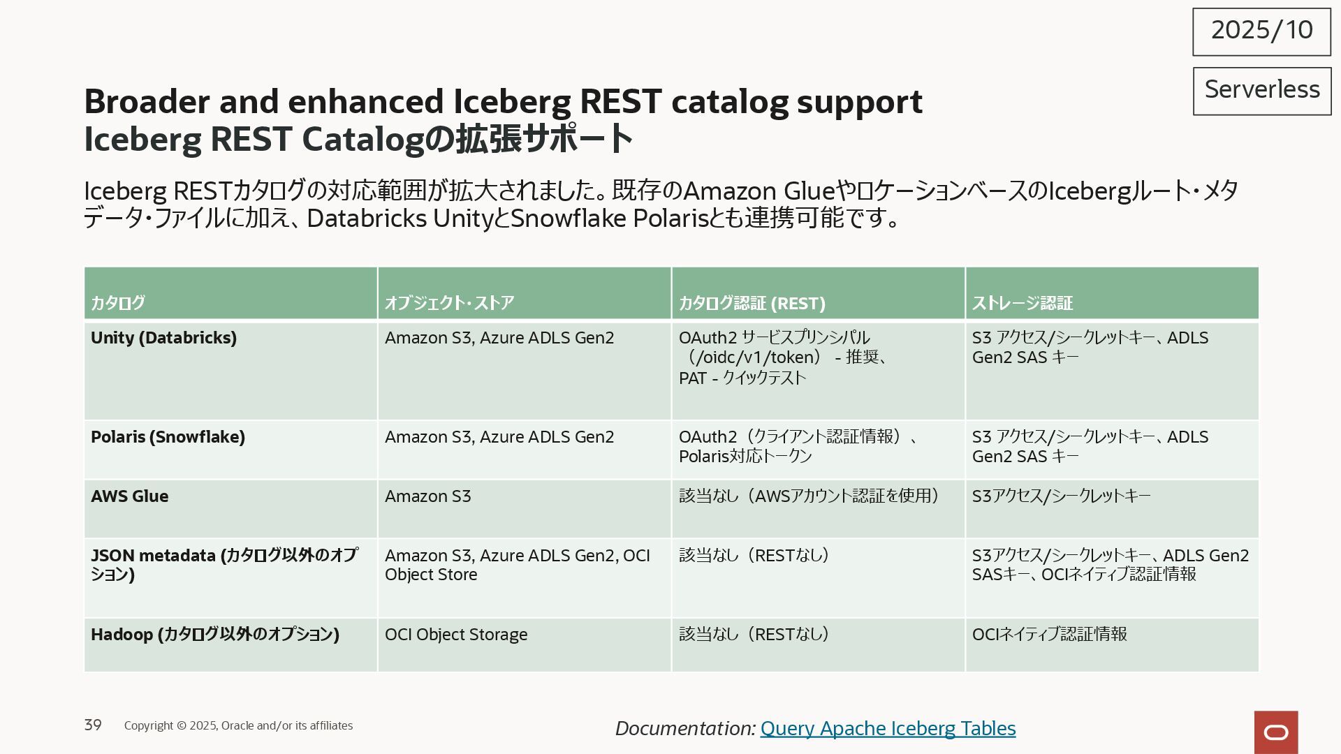 GlueやロケーションベースのIcebergルート・メタ データ・ファイルに加え、Databricks UnityとSnowflake Polarisとも連携可能です。 Documentation: Query Apache Iceberg Tables Broader and enhanced Iceberg REST catalog support Iceberg REST Catalogの拡張サポート 2025/10 Serverless カタログ オブジェクト・ストア カタログ認証 (REST) ストレージ認証 Unity (Databricks) Amazon S3, Azure ADLS Gen2 OAuth2 サービスプリンシパル (/oidc/v1/token) - 推奨、 PAT - クイックテスト S3 アクセス/シークレットキー、ADLS Gen2 SAS キー Polaris (Snowflake) Amazon S3, Azure ADLS Gen2 OAuth2(クライアント認証情報)、 Polaris対応トークン S3 アクセス/シークレットキー、ADLS Gen2 SAS キー AWS Glue Amazon S3 該当なし(AWSアカウント認証を使⽤) S3アクセス/シークレットキー JSON metadata (カタログ以外のオプ ション) Amazon S3, Azure ADLS Gen2, OCI Object Store 該当なし(RESTなし) S3アクセス/シークレットキー、ADLS Gen2 SASキー、OCIネイティブ認証情報 Hadoop (カタログ以外のオプション) OCI Object Storage 該当なし(RESTなし) OCIネイティブ認証情報