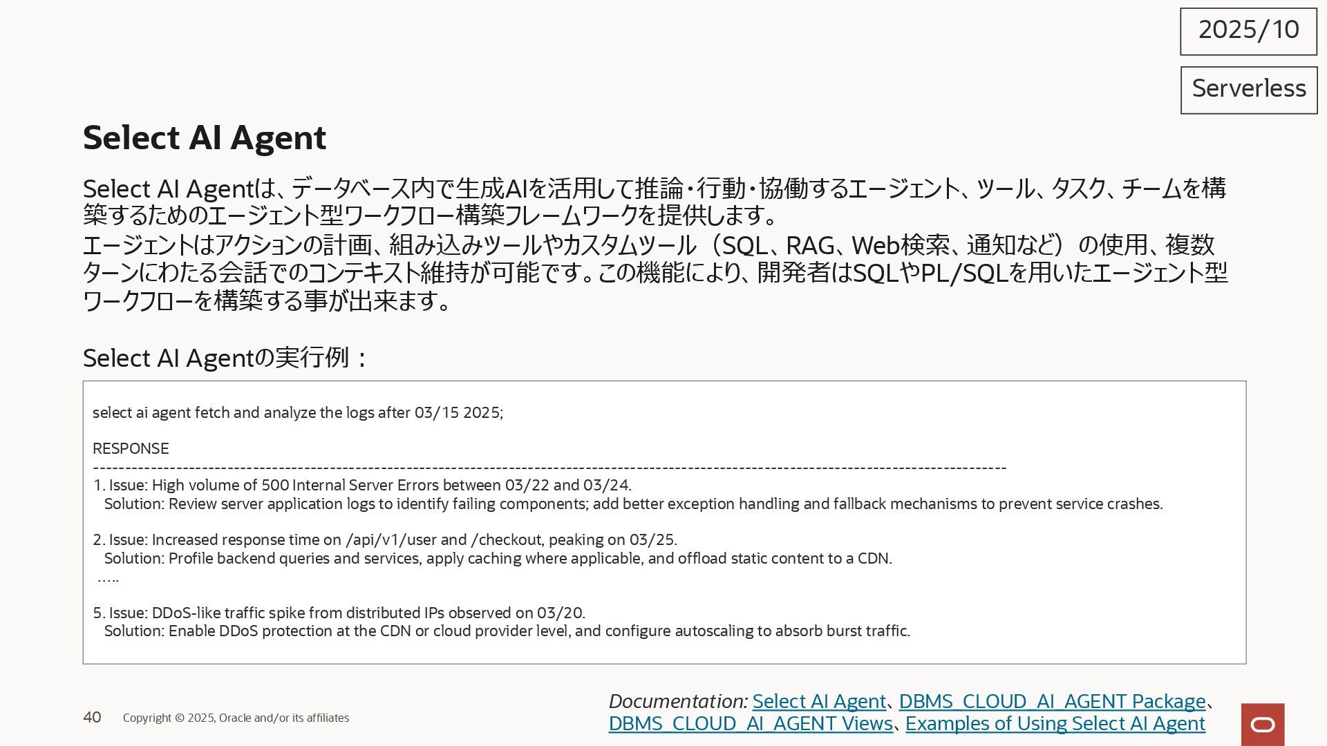 Agentは、データベース内で⽣成AIを活⽤して推論・⾏動・協働するエージェント、ツール、タスク、チームを構 築するためのエージェント型ワークフロー構築フレームワークを提供します。 エージェントはアクションの計画、組み込みツールやカスタムツール(SQL、RAG、Web検索、通知など)の使⽤、複数 ターンにわたる会話でのコンテキスト維持が可能です。この機能により、開発者はSQLやPL/SQLを⽤いたエージェント型 ワークフローを構築する事が出来ます。 Select AI Agentの実⾏例︓ Documentation: Select AI Agent、DBMS_CLOUD_AI_AGENT Package、 DBMS_CLOUD_AI_AGENT Views、Examples of Using Select AI Agent Select AI Agent 2025/10 Serverless select ai agent fetch and analyze the logs after 03/15 2025; RESPONSE ----------------------------------------------------------------------------------------------------------------------------------------------- 1. Issue: High volume of 500 Internal Server Errors between 03/22 and 03/24. Solution: Review server application logs to identify failing components; add better exception handling and fallback mechanisms to prevent service crashes. 2. Issue: Increased response time on /api/v1/user and /checkout, peaking on 03/25. Solution: Profile backend queries and services, apply caching where applicable, and offload static content to a CDN. ….. 5. Issue: DDoS-like traffic spike from distributed IPs observed on 03/20. Solution: Enable DDoS protection at the CDN or cloud provider level, and configure autoscaling to absorb burst traffic.