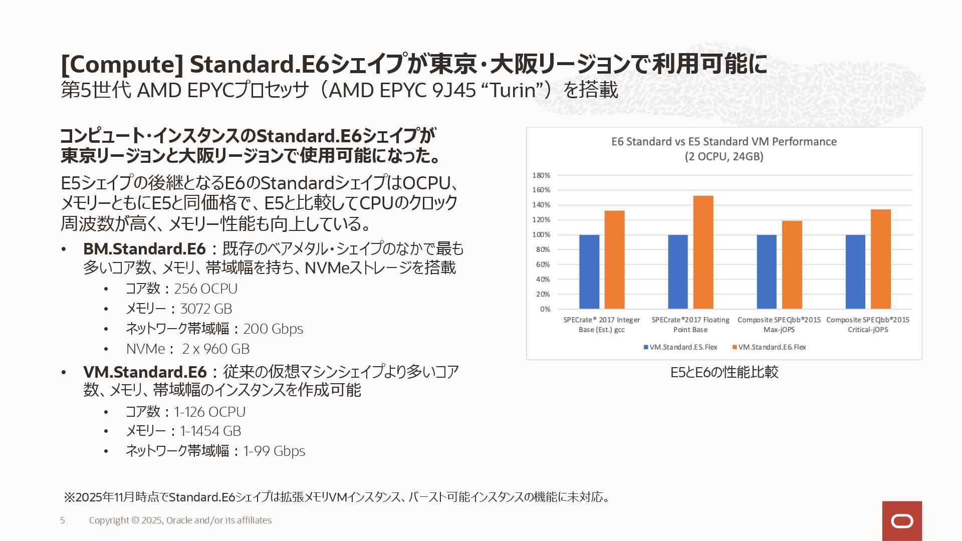 第5世代 AMD EPYCプロセッサ(AMD EPYC 9J45 “Turin”)を搭載 コンピュート・インスタンスのStandard.E6シェイプが 東京リージョンと⼤阪リージョンで使⽤可能になった。 E5シェイプの後継となるE6のStandardシェイプはOCPU、 メモリーともにE5と同価格で、E5と⽐較してCPUのクロック 周波数が⾼く、メモリー性能も向上している。 • BM.Standard.E6︓既存のベアメタル・シェイプのなかで最も 多いコア数、メモリ、帯域幅を持ち、NVMeストレージを搭載 • コア数︓256 OCPU • メモリー︓3072 GB • ネットワーク帯域幅︓200 Gbps • NVMe︓ 2 x 960 GB • VM.Standard.E6︓従来の仮想マシンシェイプより多いコア 数、メモリ、帯域幅のインスタンスを作成可能 • コア数︓1-126 OCPU • メモリー︓1-1454 GB • ネットワーク帯域幅︓1-99 Gbps E5とE6の性能⽐較 ※2025年11⽉時点でStandard.E6シェイプは拡張メモリVMインスタンス、バースト可能インスタンスの機能に未対応。