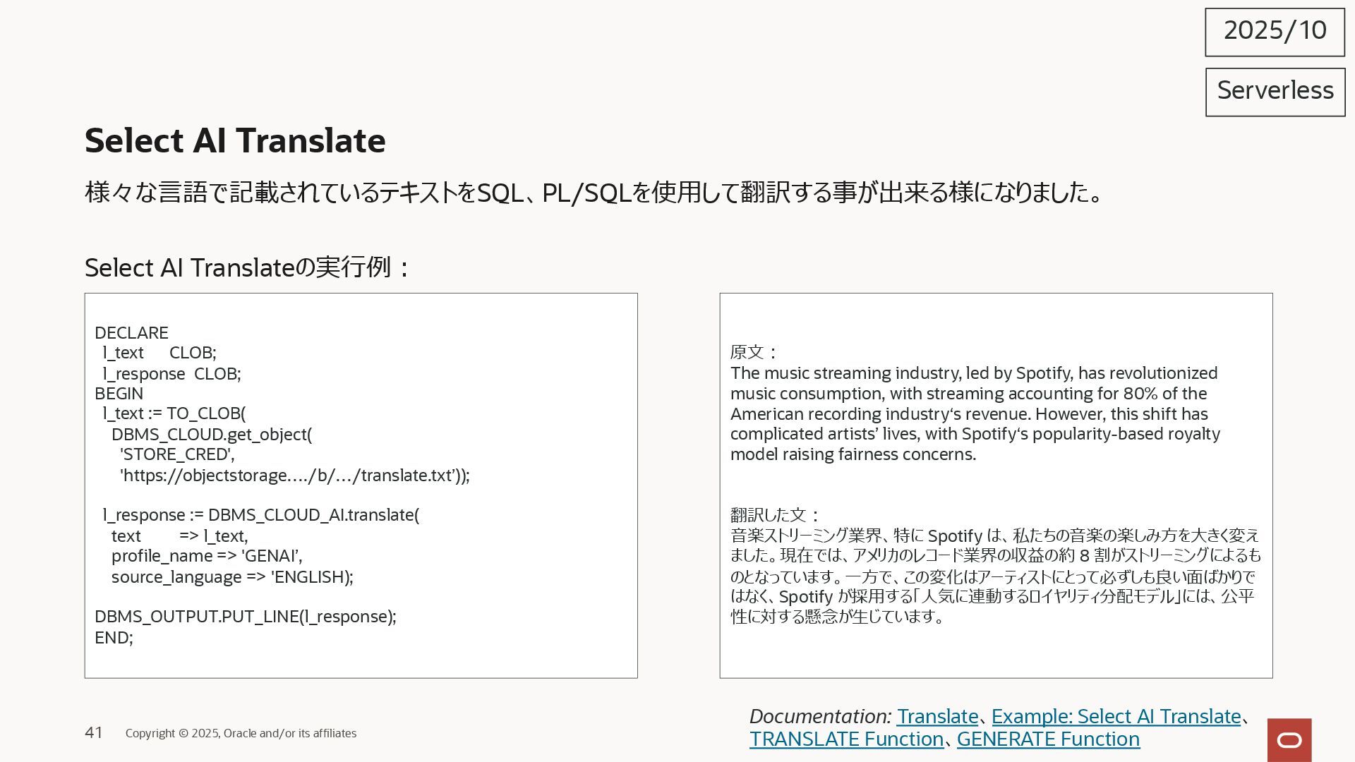 AI Translateの実⾏例︓ Documentation: Translate、Example: Select AI Translate、 TRANSLATE Function、GENERATE Function Select AI Translate 2025/10 Serverless DECLARE l_text CLOB; l_response CLOB; BEGIN l_text := TO_CLOB( DBMS_CLOUD.get_object( 'STORE_CRED', 'https://objectstorage…./b/…/translate.txt’)); l_response := DBMS_CLOUD_AI.translate( text => l_text, profile_name => 'GENAI’, source_language => 'ENGLISH); DBMS_OUTPUT.PUT_LINE(l_response); END; 原⽂︓ The music streaming industry, led by Spotify, has revolutionized music consumption, with streaming accounting for 80% of the American recording industry‘s revenue. However, this shift has complicated artists’ lives, with Spotify‘s popularity-based royalty model raising fairness concerns. 翻訳した⽂︓ ⾳楽ストリーミング業界、特に Spotify は、私たちの⾳楽の楽しみ⽅を⼤きく変え ました。現在では、アメリカのレコード業界の収益の約 8 割がストリーミングによるも のとなっています。⼀⽅で、この変化はアーティストにとって必ずしも良い⾯ばかりで はなく、Spotify が採⽤する「⼈気に連動するロイヤリティ分配モデル」には、公平 性に対する懸念が⽣じています。