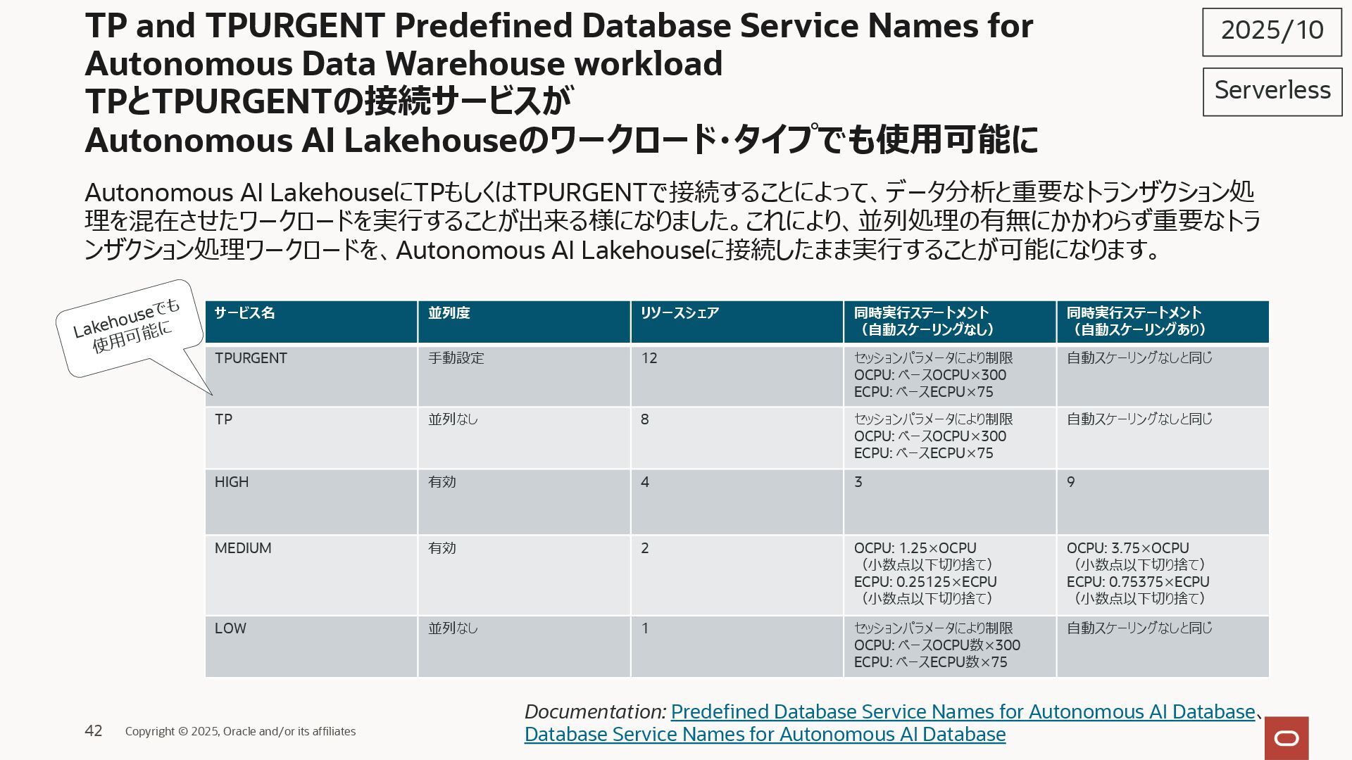 LakehouseにTPもしくはTPURGENTで接続することによって、データ分析と重要なトランザクション処 理を混在させたワークロードを実⾏することが出来る様になりました。これにより、並列処理の有無にかかわらず重要なトラ ンザクション処理ワークロードを、Autonomous AI Lakehouseに接続したまま実⾏することが可能になります。 Documentation: Predefined Database Service Names for Autonomous AI Database、 Database Service Names for Autonomous AI Database TP and TPURGENT Predefined Database Service Names for Autonomous Data Warehouse workload TPとTPURGENTの接続サービスが Autonomous AI Lakehouseのワークロード・タイプでも使⽤可能に 2025/10 Serverless サービス名 並列度 リソースシェア 同時実⾏ステートメント (⾃動スケーリングなし) 同時実⾏ステートメント (⾃動スケーリングあり) TPURGENT ⼿動設定 12 セッションパラメータにより制限 OCPU: ベースOCPU×300 ECPU: ベースECPU×75 ⾃動スケーリングなしと同じ TP 並列なし 8 セッションパラメータにより制限 OCPU: ベースOCPU×300 ECPU: ベースECPU×75 ⾃動スケーリングなしと同じ HIGH 有効 4 3 9 MEDIUM 有効 2 OCPU: 1.25×OCPU (⼩数点以下切り捨て) ECPU: 0.25125×ECPU (⼩数点以下切り捨て) OCPU: 3.75×OCPU (⼩数点以下切り捨て) ECPU: 0.75375×ECPU (⼩数点以下切り捨て) LOW 並列なし 1 セッションパラメータにより制限 OCPU: ベースOCPU数×300 ECPU: ベースECPU数×75 ⾃動スケーリングなしと同じ Lakehouseでも 使⽤可能に