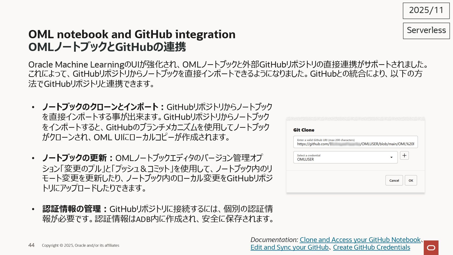 LearningのUIが強化され、OMLノートブックと外部GitHubリポジトリの直接連携がサポートされました。 これによって、GitHubリポジトリからノートブックを直接インポートできるようになりました。GitHubとの統合により、以下の⽅ 法でGitHubリポジトリと連携できます。 Documentation: Clone and Access your GitHub Notebook、 Edit and Sync your GitHub、Create GitHub Credentials OML notebook and GitHub integration OMLノートブックとGitHubの連携 2025/11 Serverless • ノートブックのクローンとインポート︓GitHubリポジトリからノートブック を直接インポートする事が出来ます。GitHubリポジトリからノートブック をインポートすると、GitHubのブランチメカニズムを使⽤してノートブック がクローンされ、OML UIにローカルコピーが作成されます。 • ノートブックの更新︓OMLノートブックエディタのバージョン管理オプ ション「変更のプル」と「プッシュ&コミット」を使⽤して、ノートブック内のリ モート変更を更新したり、ノートブック内のローカル変更をGitHubリポジ トリにアップロードしたりできます。 • 認証情報の管理︓GitHubリポジトリに接続するには、個別の認証情 報が必要です。認証情報はADB内に作成され、安全に保存されます。