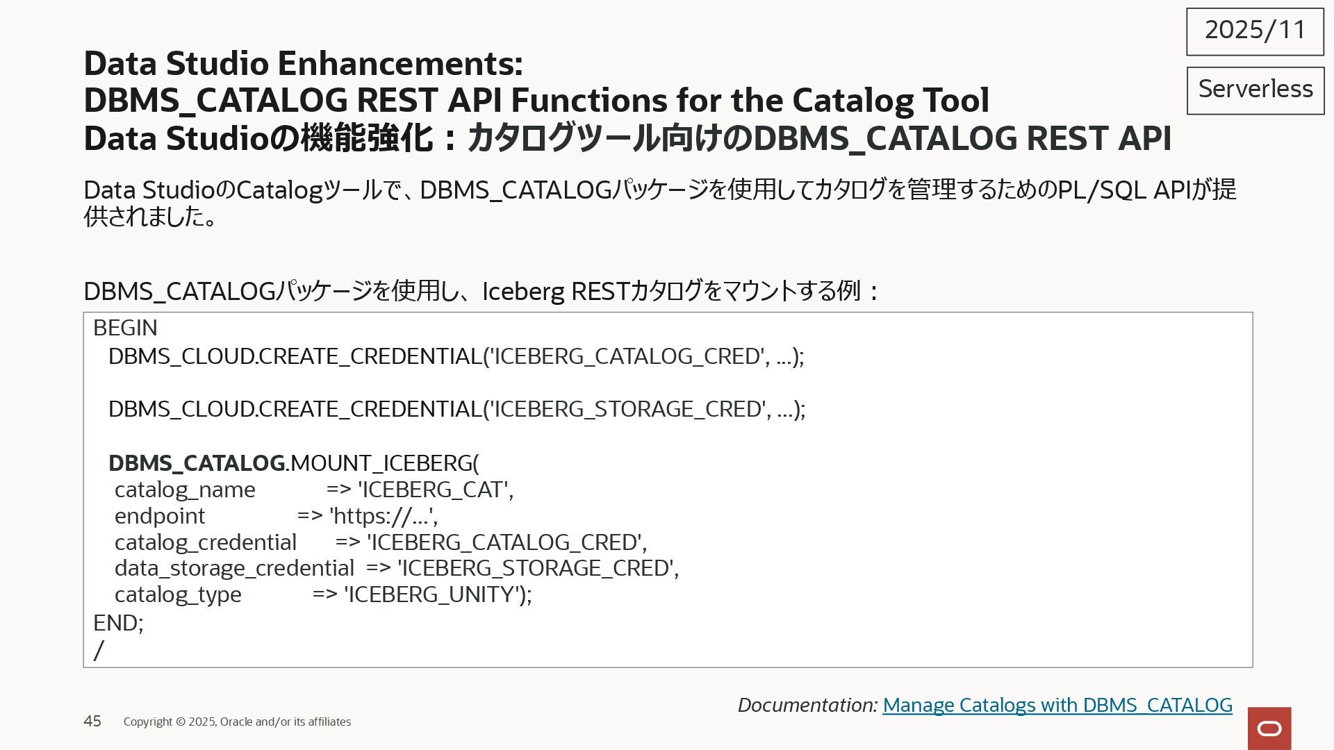 APIが提 供されました。 DBMS_CATALOGパッケージを使⽤し、 Iceberg RESTカタログをマウントする例︓ Documentation: Manage Catalogs with DBMS_CATALOG Data Studio Enhancements: DBMS_CATALOG REST API Functions for the Catalog Tool Data Studioの機能強化︓カタログツール向けのDBMS_CATALOG REST API 2025/11 Serverless BEGIN DBMS_CLOUD.CREATE_CREDENTIAL('ICEBERG_CATALOG_CRED', ...); DBMS_CLOUD.CREATE_CREDENTIAL('ICEBERG_STORAGE_CRED', ...); DBMS_CATALOG.MOUNT_ICEBERG( catalog_name => 'ICEBERG_CAT', endpoint => 'https://...', catalog_credential => 'ICEBERG_CATALOG_CRED', data_storage_credential => 'ICEBERG_STORAGE_CRED', catalog_type => 'ICEBERG_UNITY'); END; /