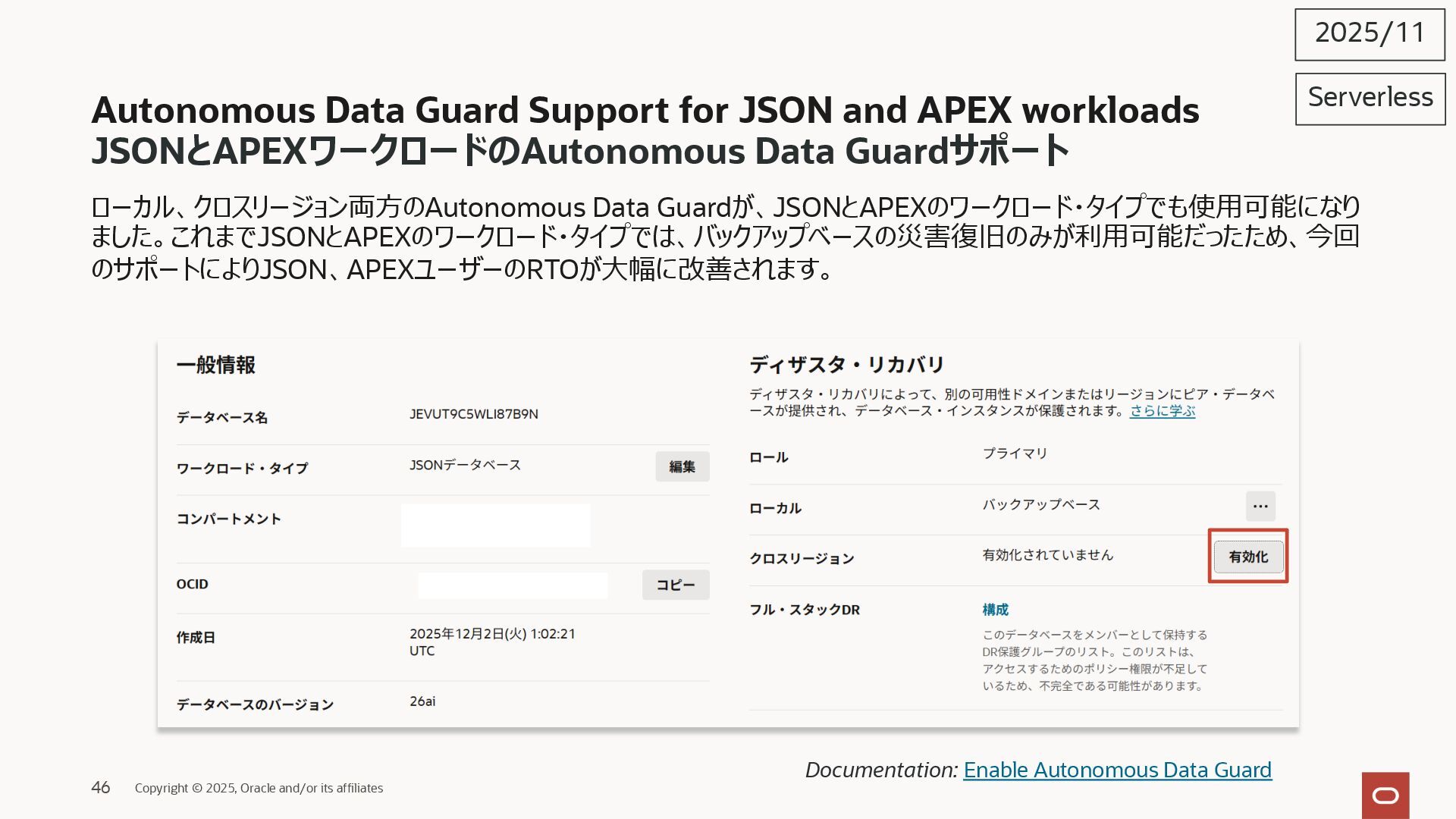 Guardが、JSONとAPEXのワークロード・タイプでも使⽤可能になり ました。これまでJSONとAPEXのワークロード・タイプでは、バックアップベースの災害復旧のみが利⽤可能だったため、今回 のサポートによりJSON、APEXユーザーのRTOが⼤幅に改善されます。 Documentation: Enable Autonomous Data Guard Autonomous Data Guard Support for JSON and APEX workloads JSONとAPEXワークロードのAutonomous Data Guardサポート 2025/11 Serverless