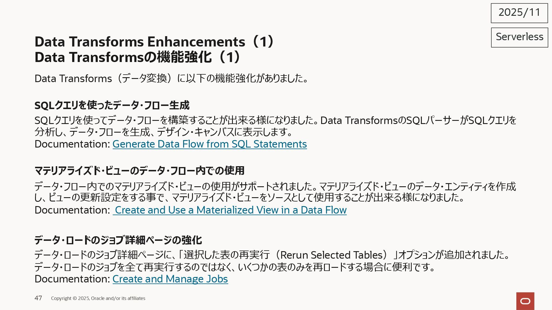 SQLクエリを使ったデータ・フロー⽣成 SQLクエリを使ってデータ・フローを構築することが出来る様になりました。Data TransformsのSQLパーサーがSQLクエリを 分析し、データ・フローを⽣成、デザイン・キャンバスに表⽰します。 Documentation: Generate Data Flow from SQL Statements マテリアライズド・ビューのデータ・フロー内での使⽤ データ・フロー内でのマテリアライズド・ビューの使⽤がサポートされました。マテリアライズド・ビューのデータ・エンティティを作成 し、ビューの更新設定をする事で、マテリアライズド・ビューをソースとして使⽤することが出来る様になりました。 Documentation: Create and Use a Materialized View in a Data Flow データ・ロードのジョブ詳細ページの強化 データ・ロードのジョブ詳細ページに、「選択した表の再実⾏(Rerun Selected Tables)」オプションが追加されました。 データ・ロードのジョブを全て再実⾏するのではなく、いくつかの表のみを再ロードする場合に便利です。 Documentation: Create and Manage Jobs Data Transforms Enhancements(1) Data Transformsの機能強化(1) 2025/11 Serverless