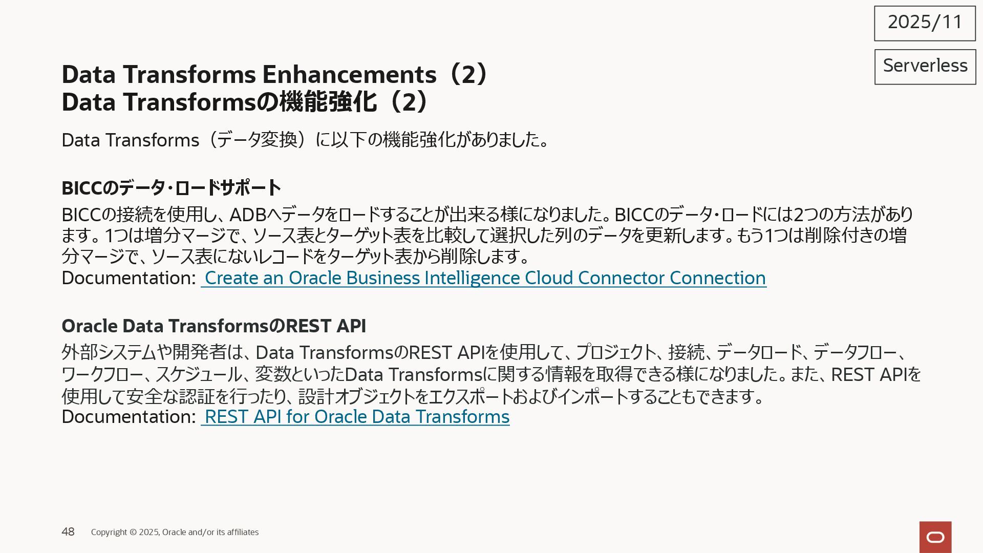 BICCのデータ・ロードサポート BICCの接続を使⽤し、ADBへデータをロードすることが出来る様になりました。BICCのデータ・ロードには2つの⽅法があり ます。1つは増分マージで、ソース表とターゲット表を⽐較して選択した列のデータを更新します。もう1つは削除付きの増 分マージで、ソース表にないレコードをターゲット表から削除します。 Documentation: Create an Oracle Business Intelligence Cloud Connector Connection Oracle Data TransformsのREST API 外部システムや開発者は、Data TransformsのREST APIを使⽤して、プロジェクト、接続、データロード、データフロー、 ワークフロー、スケジュール、変数といったData Transformsに関する情報を取得できる様になりました。また、REST APIを 使⽤して安全な認証を⾏ったり、設計オブジェクトをエクスポートおよびインポートすることもできます。 Documentation: REST API for Oracle Data Transforms Data Transforms Enhancements(2) Data Transformsの機能強化(2) 2025/11 Serverless