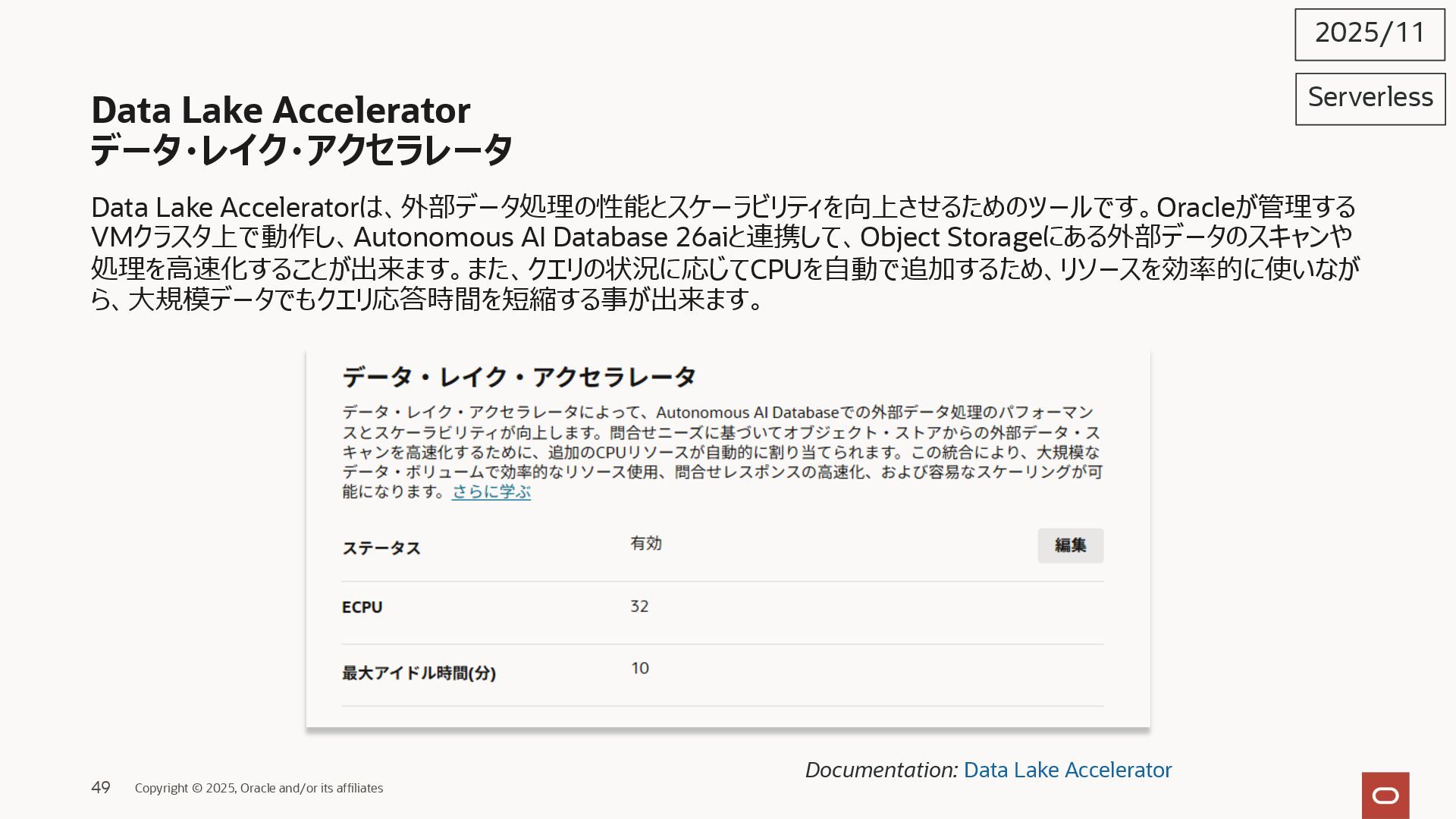 Acceleratorは、外部データ処理の性能とスケーラビリティを向上させるためのツールです。Oracleが管理する VMクラスタ上で動作し、Autonomous AI Database 26aiと連携して、Object Storageにある外部データのスキャンや 処理を⾼速化することが出来ます。また、クエリの状況に応じてCPUを⾃動で追加するため、リソースを効率的に使いなが ら、⼤規模データでもクエリ応答時間を短縮する事が出来ます。 Documentation: Data Lake Accelerator Data Lake Accelerator データ・レイク・アクセラレータ 2025/11 Serverless