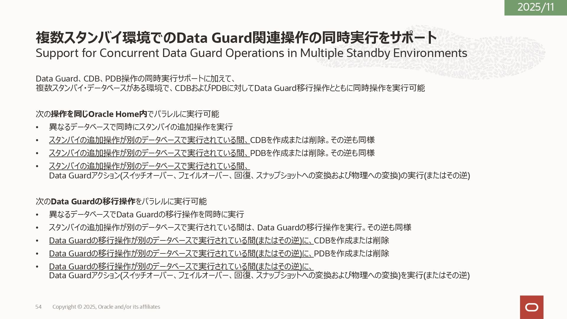 • スタンバイの追加操作が別のデータベースで実⾏されている間、CDBを作成または削除。その逆も同様 • スタンバイの追加操作が別のデータベースで実⾏されている間、PDBを作成または削除。その逆も同様 • スタンバイの追加操作が別のデータベースで実⾏されている間、 Data Guardアクション(スイッチオーバー、フェイルオーバー、回復、スナップショットへの変換および物理への変換)の実⾏(またはその逆) 次のData Guardの移⾏操作をパラレルに実⾏可能 • 異なるデータベースでData Guardの移⾏操作を同時に実⾏ • スタンバイの追加操作が別のデータベースで実⾏されている間は、Data Guardの移⾏操作を実⾏。その逆も同様 • Data Guardの移⾏操作が別のデータベースで実⾏されている間(またはその逆)に、CDBを作成または削除 • Data Guardの移⾏操作が別のデータベースで実⾏されている間(またはその逆)に、PDBを作成または削除 • Data Guardの移⾏操作が別のデータベースで実⾏されている間(またはその逆)に、 Data Guardアクション(スイッチオーバー、フェイルオーバー、回復、スナップショットへの変換および物理への変換)を実⾏(またはその逆) Support for Concurrent Data Guard Operations in Multiple Standby Environments 2025/11 Copyright © 2025, Oracle and/or its affiliates 54