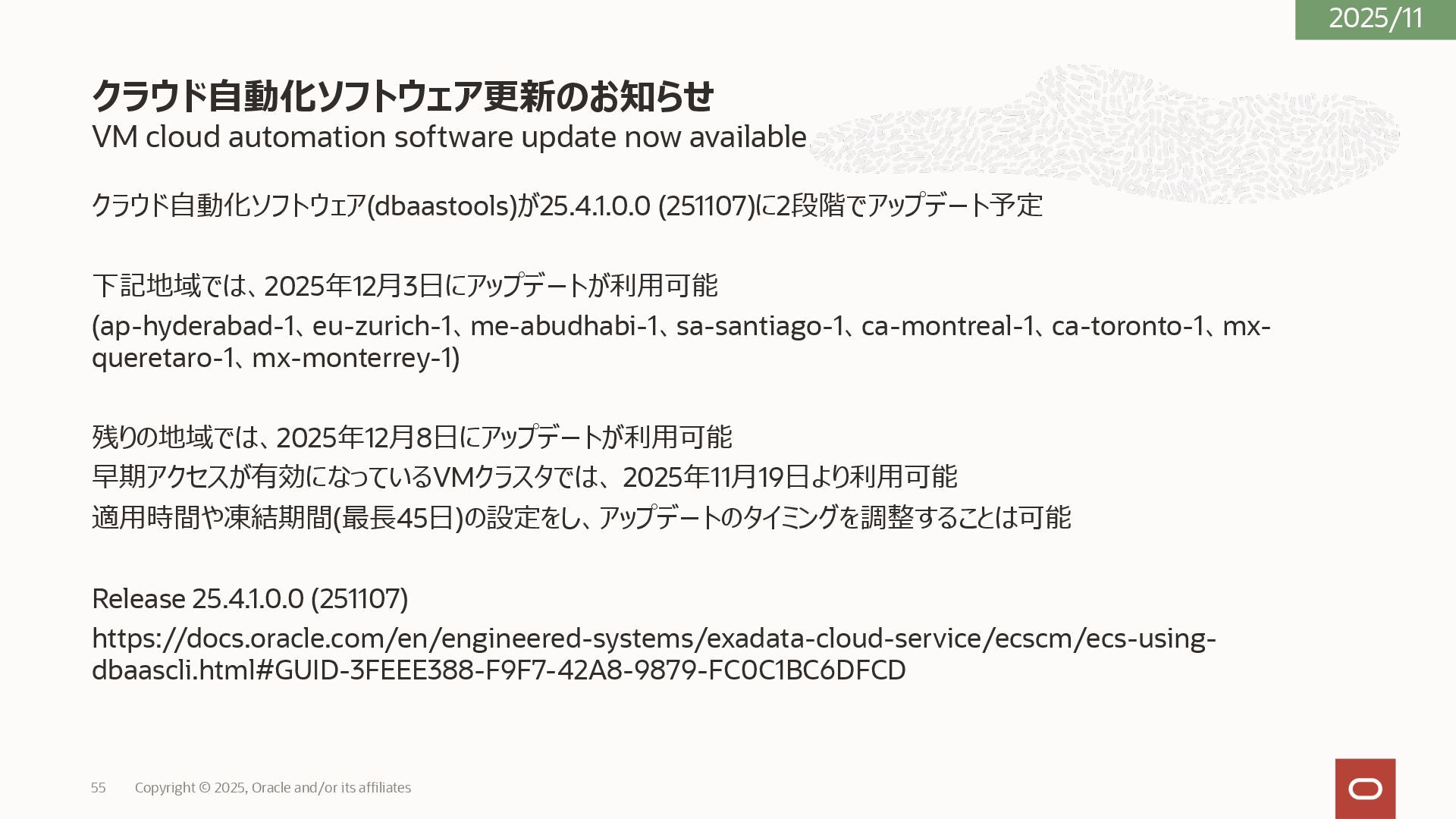 41. Exadata Database Service on Dedicated Infrastructure (ExaDB-D) サービス・アップデート 2025年11⽉ https://docs.oracle.com/en/engineered-