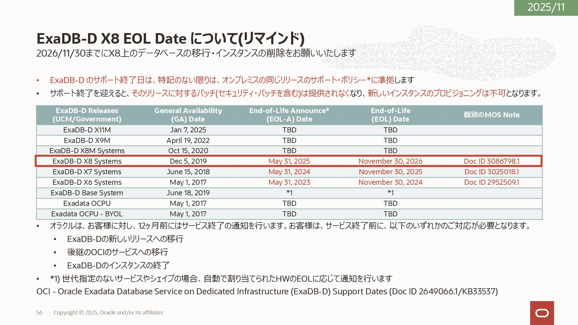 • 後継のOCIのサービスへの移⾏ • ExaDB-Dのインスタンスの終了 • *1) 世代指定のないサービスやシェイプの場合、⾃動で割り当てられたHWのEOLに応じて通知を⾏います OCI - Oracle Exadata Database Service on Dedicated Infrastructure (ExaDB-D) Support Dates (Doc ID 2649066.1/KB33537) ExaDB-D X8 EOL Date について(リマインド) ExaDB-D Releases (UCM/Government) General Availability (GA) Date End-of-Life Announce* (EOL-A) Date End-of-Life (EOL) Date 個別のMOS Note ExaDB-D X11M Jan 7, 2025 TBD TBD ExaDB-D X9M April 19, 2022 TBD TBD ExaDB-D X8M Systems Oct 15, 2020 TBD TBD ExaDB-D X8 Systems Dec 5, 2019 May 31, 2025 November 30, 2026 Doc ID 3086798.1 ExaDB-D X7 Systems June 15, 2018 May 31, 2024 November 30, 2025 Doc ID 3025018.1 ExaDB-D X6 Systems May 1, 2017 May 31, 2023 November 30, 2024 Doc ID 2952509.1 ExaDB-D Base System June 18, 2019 *1 *1 Exadata OCPU May 1, 2017 TBD TBD Exadata OCPU - BYOL May 1, 2017 TBD TBD 2025/11 Copyright © 2025, Oracle and/or its affiliates 56