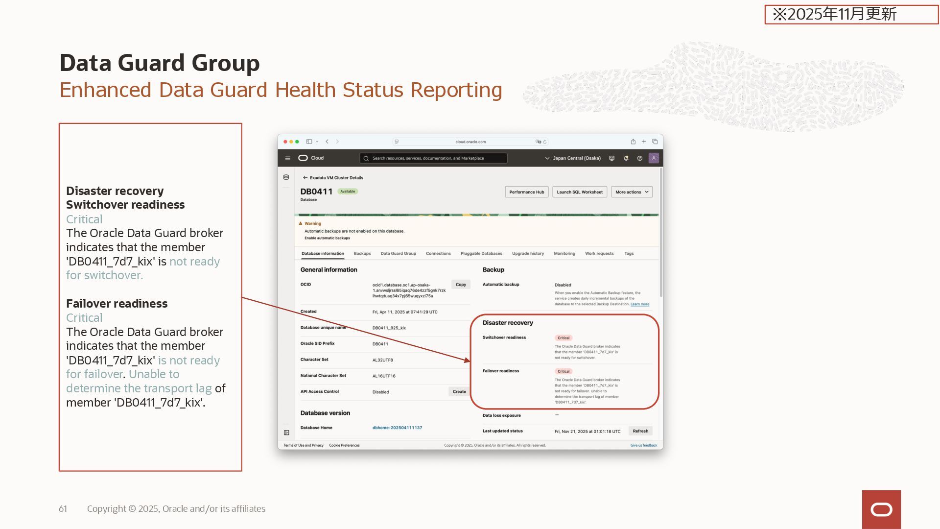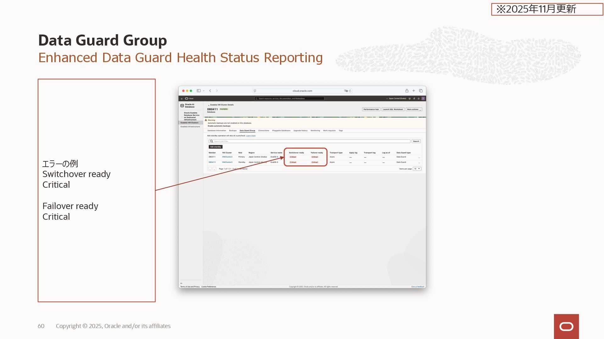 エラーの例 Switchover ready Critical Failover ready Critical Copyright © 2025, Oracle and/or its affiliates 60