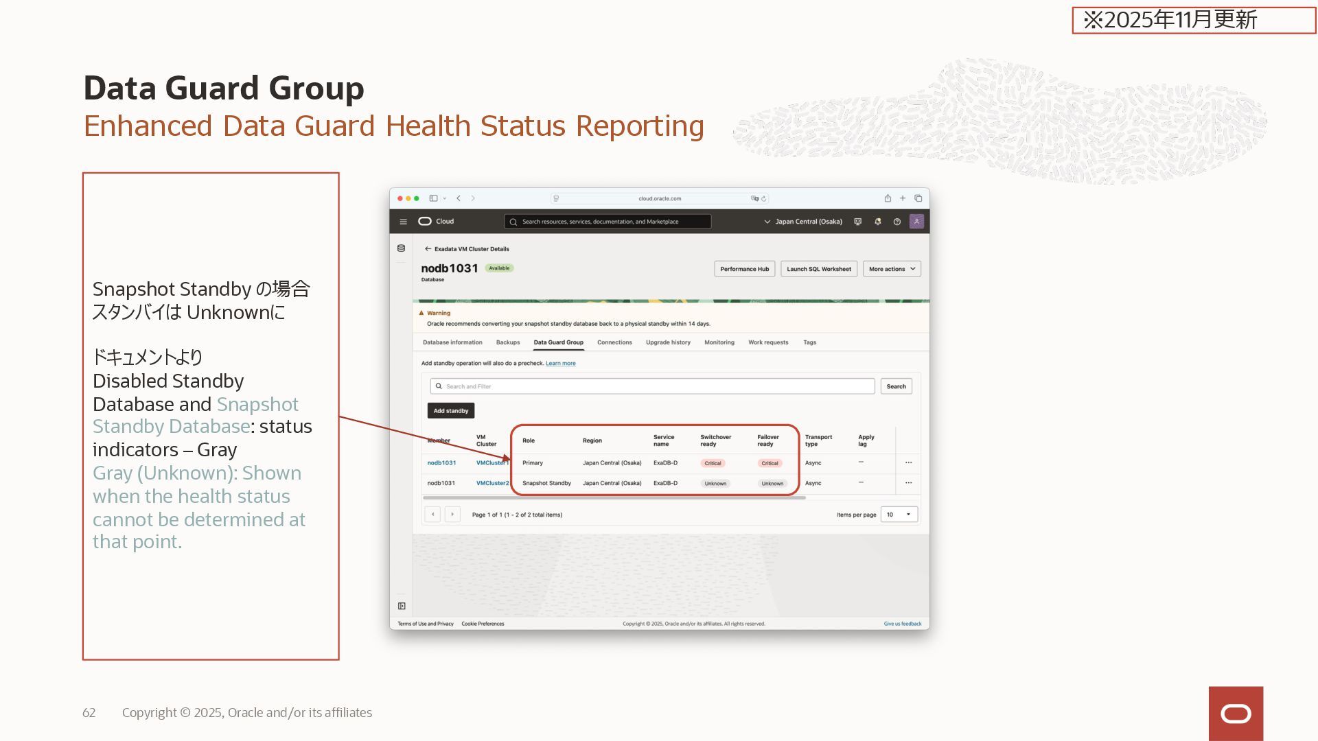 Snapshot Standby の場合 スタンバイは Unknownに ドキュメントより Disabled Standby Database and Snapshot Standby Database: status indicators – Gray Gray (Unknown): Shown when the health status cannot be determined at that point. Copyright © 2025, Oracle and/or its affiliates 62