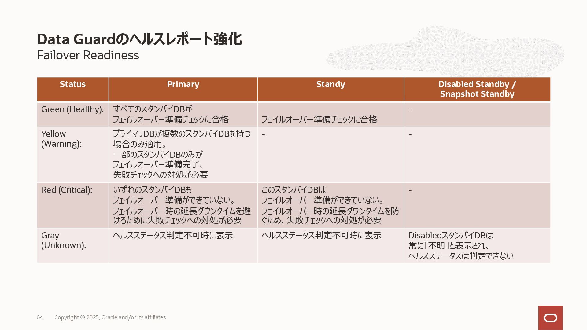 Green (Healthy): すべてのスタンバイDBが スイッチオーバー準備チェックに合格 スイッチオーバー準備チェックに合格 - Yellow (Warning): プライマリDBが複数のスタンバイDBを持つ 場合のみ適⽤。 ⼀部のスタンバイDBのみが スイッチオーバー準備完了、 失敗チェックへの対処が必要 - - Red (Critical): いずれのスタンバイDBも スイッチオーバー準備ができていない。 スイッチオーバー時の延⻑ダウンタイムを避 けるために失敗チェックへの対処が必要 このスタンバイDBは スイッチオーバー準備ができていない。 スイッチオーバー時の延⻑ダウンタイムを防 ぐため、失敗チェックへの対処が必要 - Gray (Unknown): ヘルスステータス判定不可時に表⽰ ヘルスステータス判定不可時に表⽰ DisabledスタンバイDBは 常に「不明」と表⽰され、 ヘルスステータスは判定できない Switchover Readiness Copyright © 2025, Oracle and/or its affiliates 63
