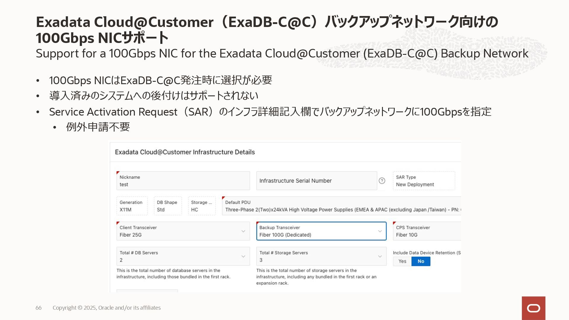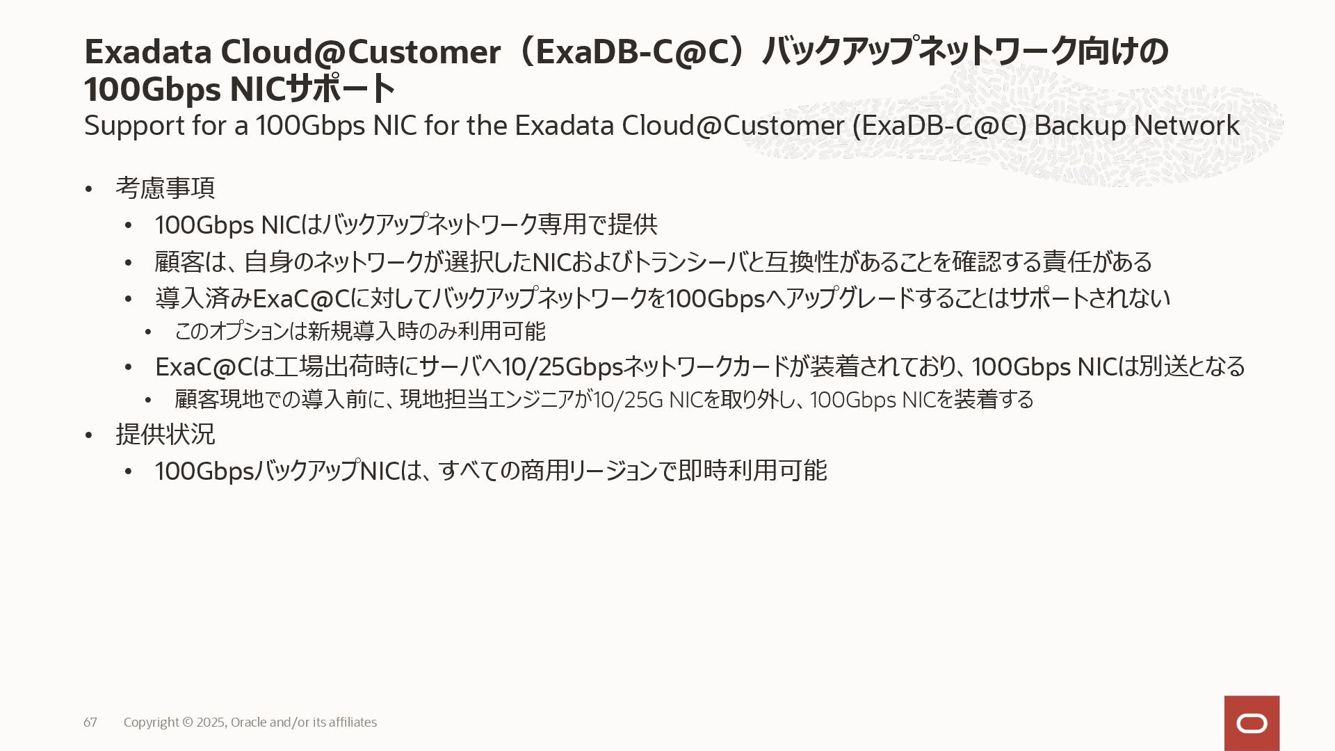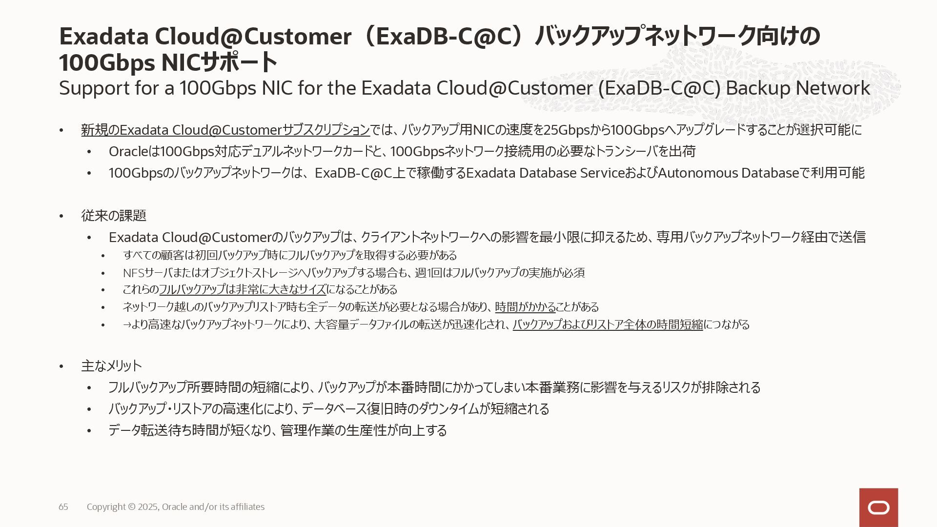 100Gbpsのバックアップネットワークは、 ExaDB-C@C上で稼働するExadata Database ServiceおよびAutonomous Databaseで利⽤可能 • 従来の課題 • Exadata Cloud@Customerのバックアップは、クライアントネットワークへの影響を最⼩限に抑えるため、専⽤バックアップネットワーク経由で送信 • すべての顧客は初回バックアップ時にフルバックアップを取得する必要がある • NFSサーバまたはオブジェクトストレージへバックアップする場合も、週1回はフルバックアップの実施が必須 • これらのフルバックアップは⾮常に⼤きなサイズになることがある • ネットワーク越しのバックアップリストア時も全データの転送が必要となる場合があり、時間がかかることがある • →より⾼速なバックアップネットワークにより、⼤容量データファイルの転送が迅速化され、バックアップおよびリストア全体の時間短縮につながる • 主なメリット • フルバックアップ所要時間の短縮により、バックアップが本番時間にかかってしまい本番業務に影響を与えるリスクが排除される • バックアップ・リストアの⾼速化により、データベース復旧時のダウンタイムが短縮される • データ転送待ち時間が短くなり、管理作業の⽣産性が向上する Support for a 100Gbps NIC for the Exadata Cloud@Customer (ExaDB-C@C) Backup Network Copyright © 2025, Oracle and/or its affiliates 65