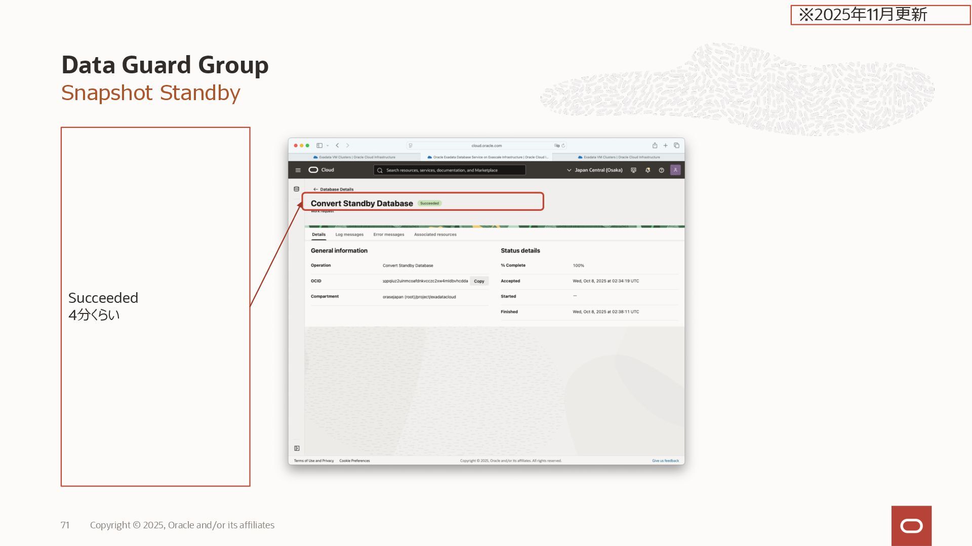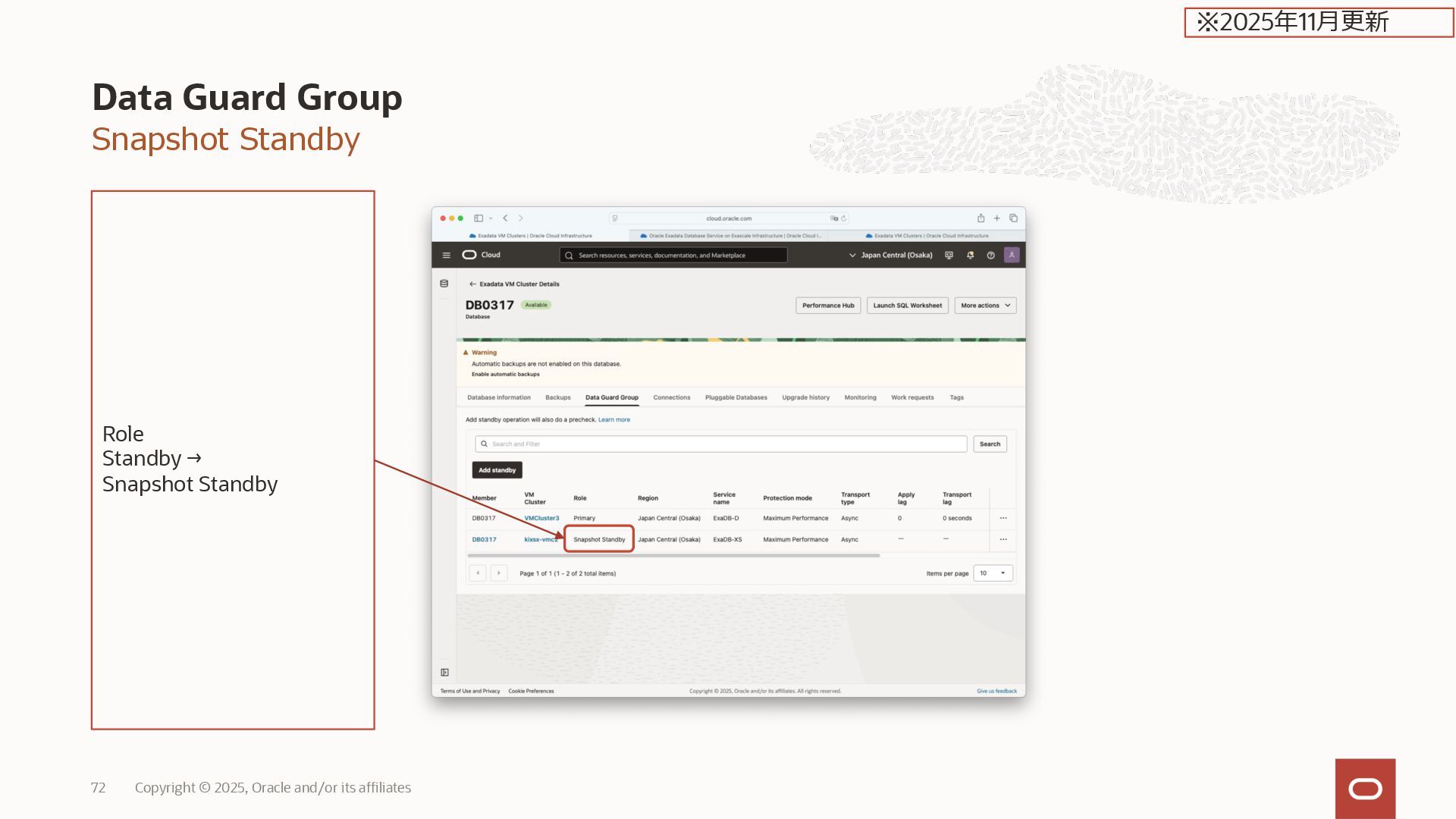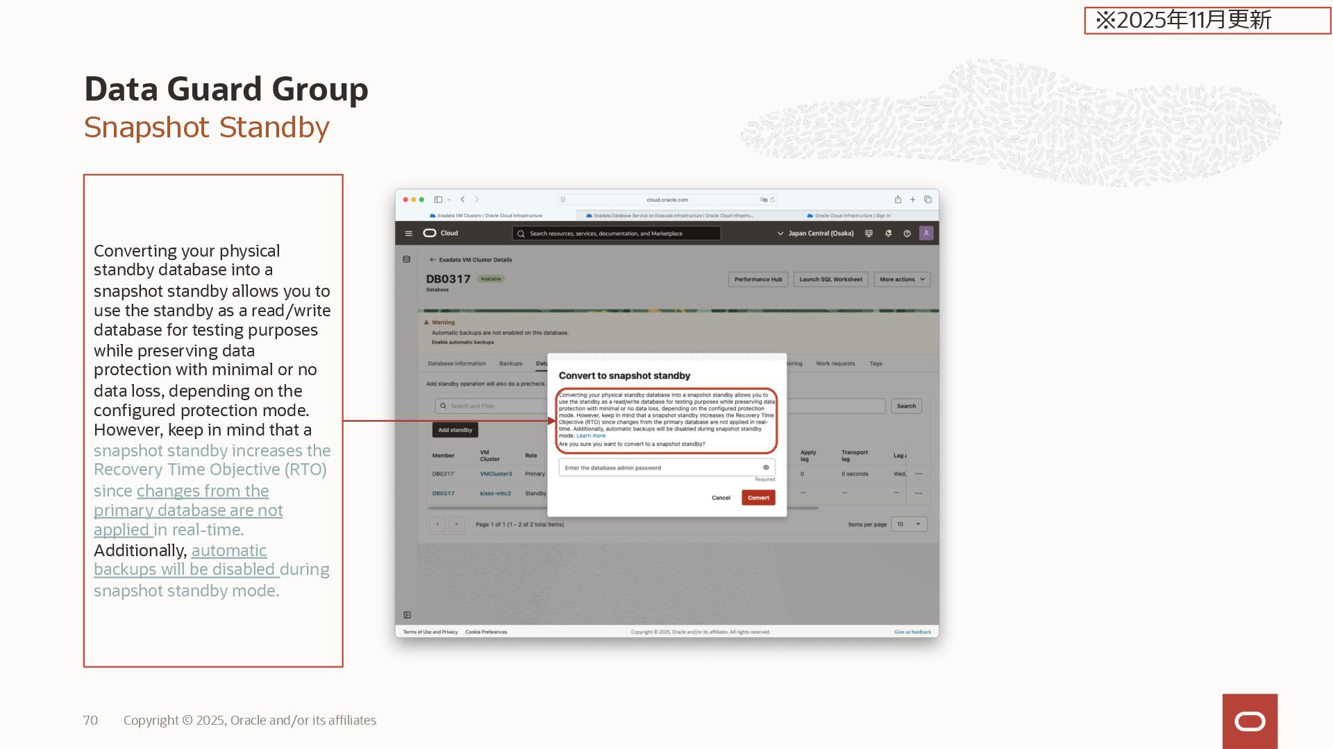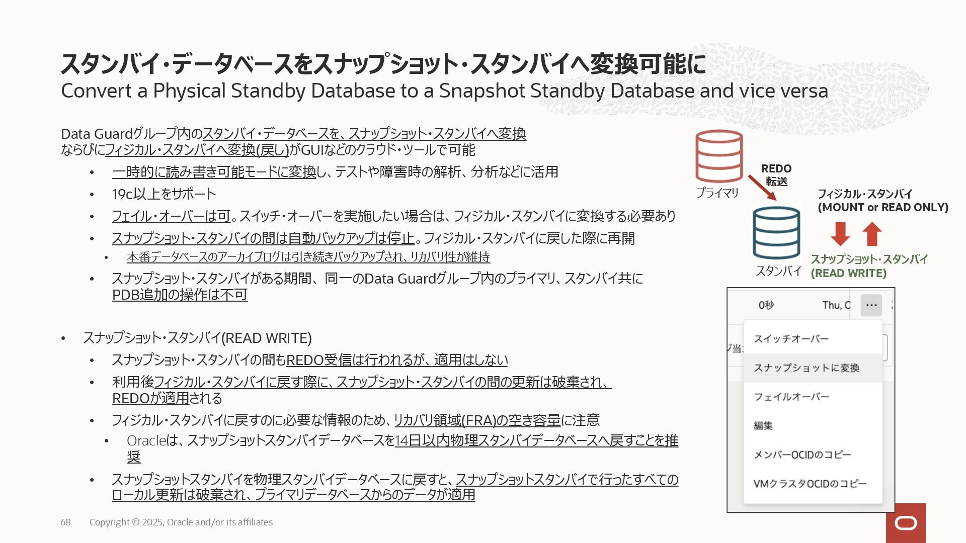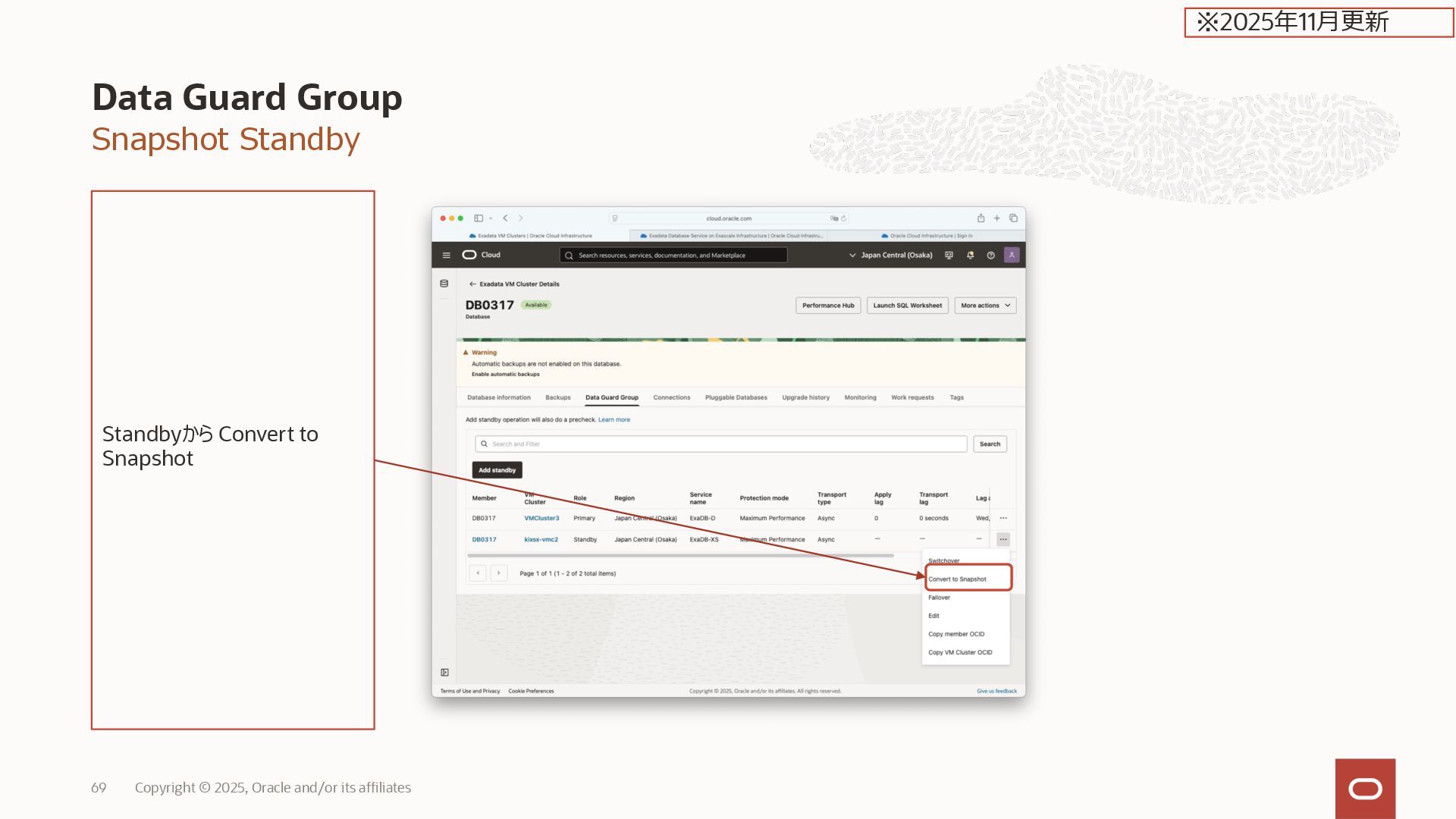 • スナップショット・スタンバイの間は⾃動バックアップは停⽌。フィジカル・スタンバイに戻した際に再開 • 本番データベースのアーカイブログは引き続きバックアップされ、リカバリ性が維持 • スナップショット・スタンバイがある期間、 同⼀のData Guardグループ内のプライマリ、スタンバイ共に PDB追加の操作は不可 • スナップショット・スタンバイ(READ WRITE) • スナップショット・スタンバイの間もREDO受信は⾏われるが、適⽤はしない • 利⽤後フィジカル・スタンバイに戻す際に、スナップショット・スタンバイの間の更新は破棄され、 REDOが適⽤される • フィジカル・スタンバイに戻すのに必要な情報のため、リカバリ領域(FRA)の空き容量に注意 • Oracleは、スナップショットスタンバイデータベースを14⽇以内物理スタンバイデータベースへ戻すことを推 奨 • スナップショットスタンバイを物理スタンバイデータベースに戻すと、スナップショットスタンバイで⾏ったすべての ローカル更新は破棄され、プライマリデータベースからのデータが適⽤ Convert a Physical Standby Database to a Snapshot Standby Database and vice versa スナップショット・スタンバイ (READ WRITE) REDO 転送 プライマリ フィジカル・スタンバイ (MOUNT or READ ONLY) スタンバイ Copyright © 2025, Oracle and/or its affiliates 68