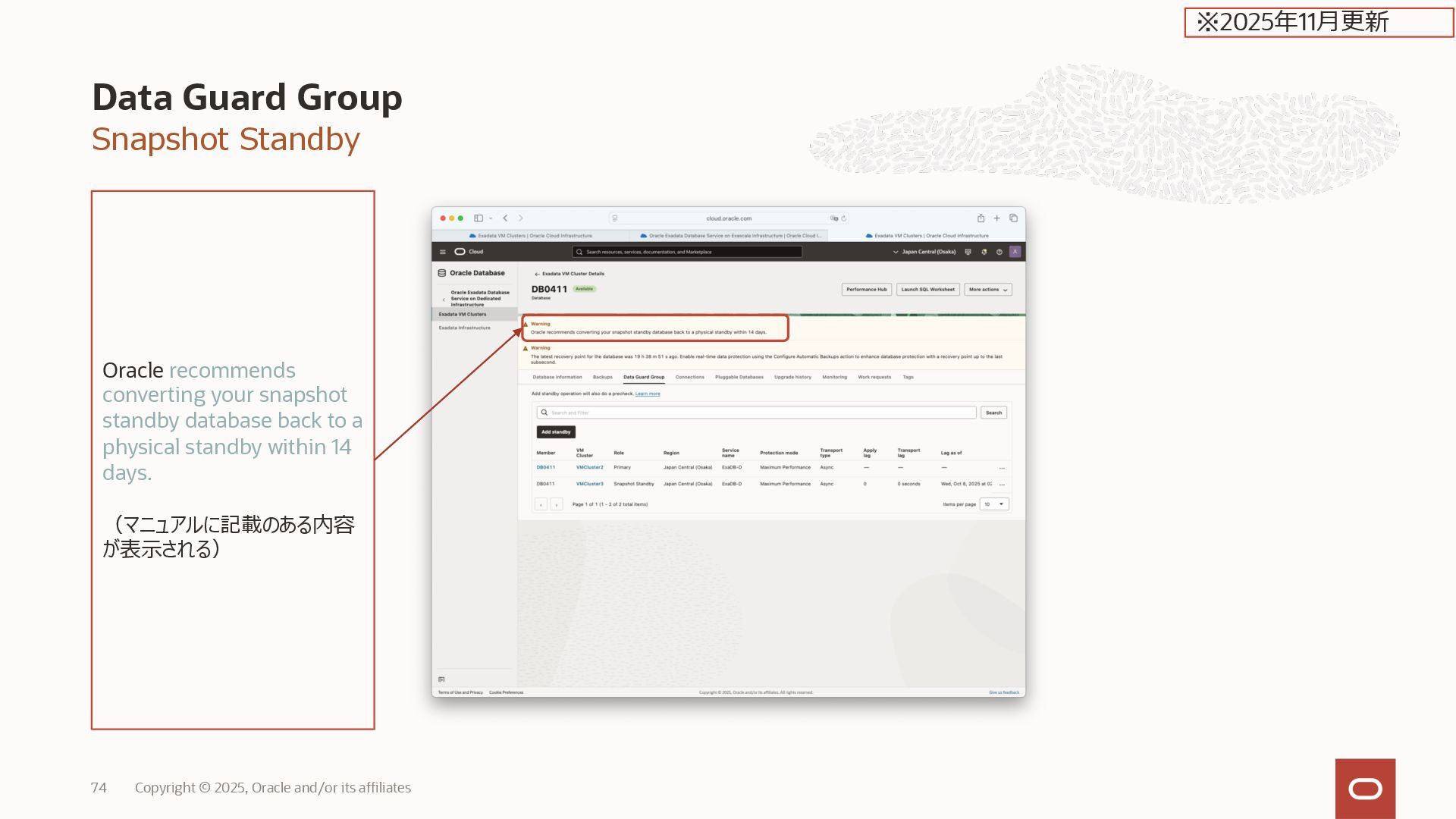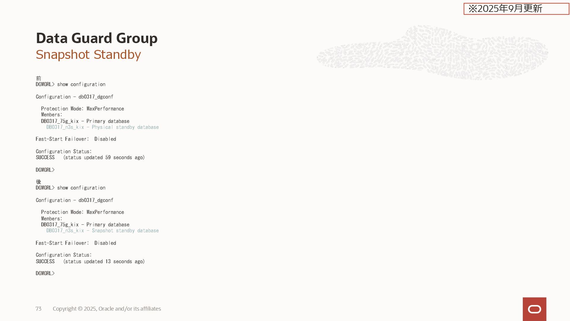 Mode: MaxPerformance Members: DB0317_75g_kix - Primary database DB0317_n3s_kix - Physical standby database Fast-Start Failover: Disabled Configuration Status: SUCCESS (status updated 59 seconds ago) DGMGRL> 後 DGMGRL> show configuration Configuration - db0317_dgconf Protection Mode: MaxPerformance Members: DB0317_75g_kix - Primary database DB0317_n3s_kix - Snapshot standby database Fast-Start Failover: Disabled Configuration Status: SUCCESS (status updated 13 seconds ago) DGMGRL> Data Guard Group ※2025年9⽉更新 Copyright © 2025, Oracle and/or its affiliates 73