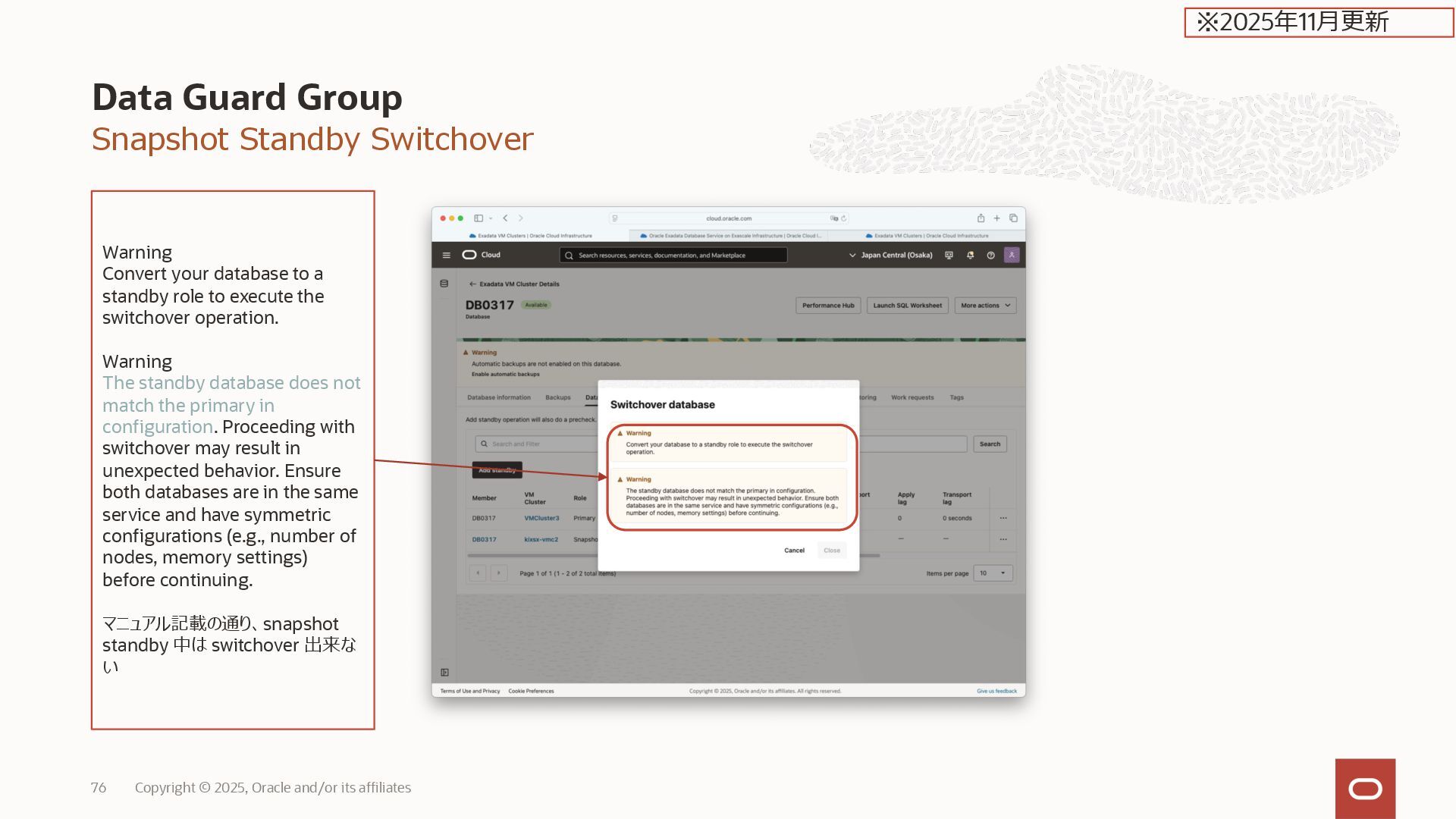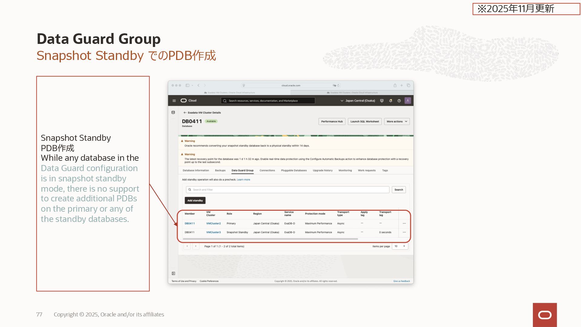 database to a standby role to execute the switchover operation. Warning The standby database does not match the primary in configuration. Proceeding with switchover may result in unexpected behavior. Ensure both databases are in the same service and have symmetric configurations (e.g., number of nodes, memory settings) before continuing. マニュアル記載の通り、snapshot standby 中は switchover 出来な い Copyright © 2025, Oracle and/or its affiliates 76