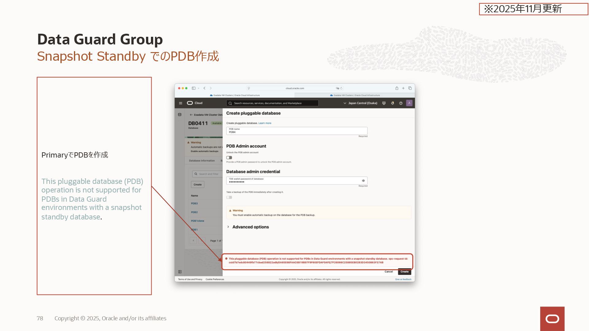 database (PDB) operation is not supported for PDBs in Data Guard environments with a snapshot standby database. Copyright © 2025, Oracle and/or its affiliates 78