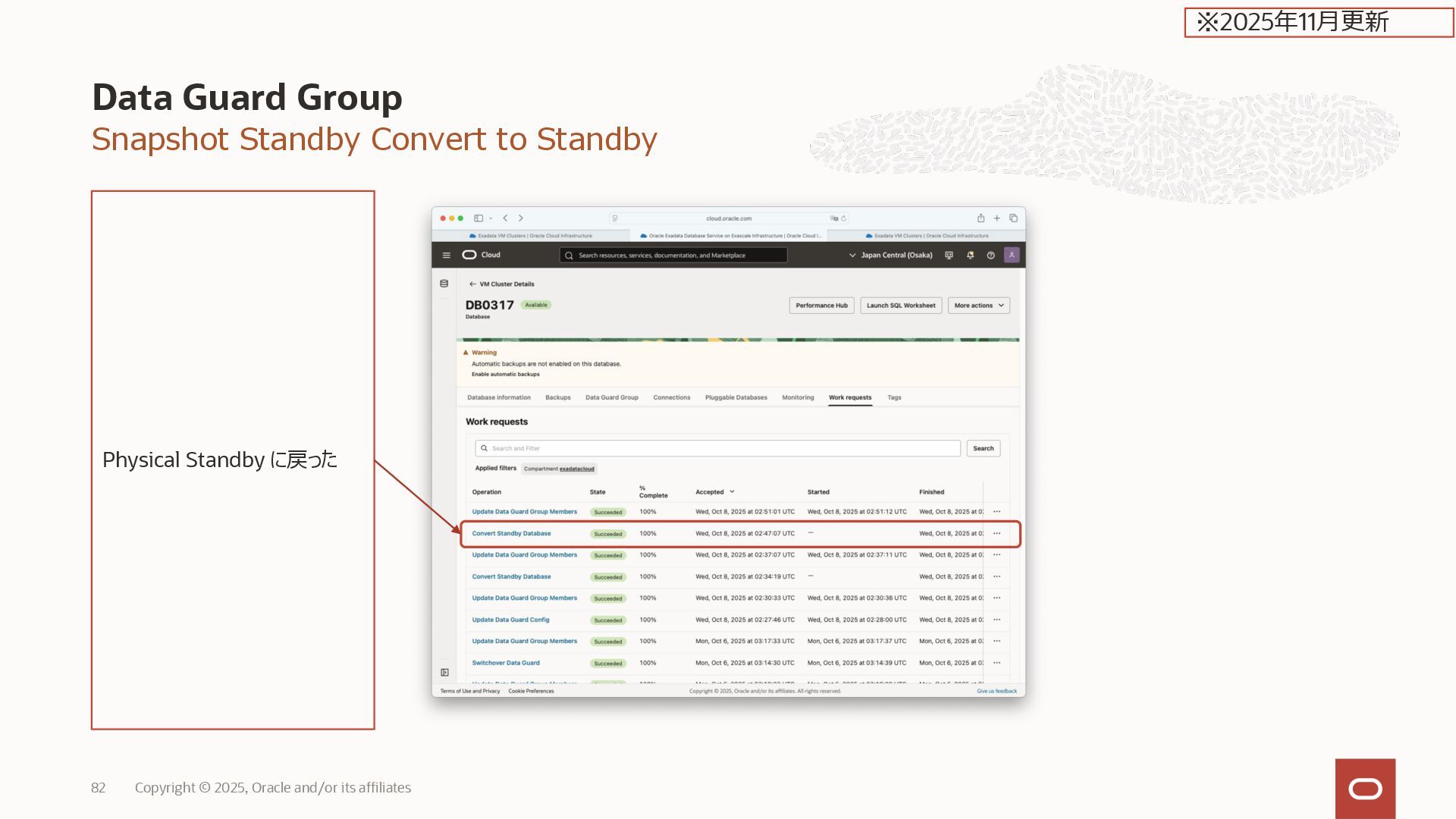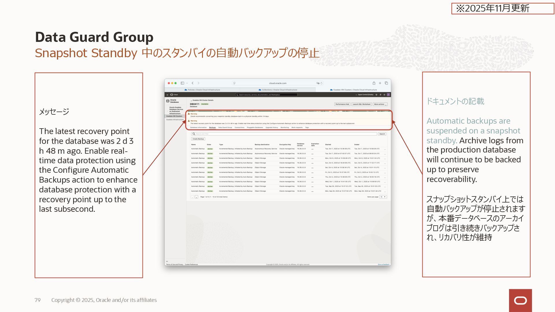 recovery point for the database was 2 d 3 h 48 m ago. Enable real- time data protection using the Configure Automatic Backups action to enhance database protection with a recovery point up to the last subsecond. ドキュメントの記載 Automatic backups are suspended on a snapshot standby. Archive logs from the production database will continue to be backed up to preserve recoverability. スナップショットスタンバイ上では ⾃動バックアップが停⽌されます が、本番データベースのアーカイ ブログは引き続きバックアップさ れ、リカバリ性が維持 Copyright © 2025, Oracle and/or its affiliates 79