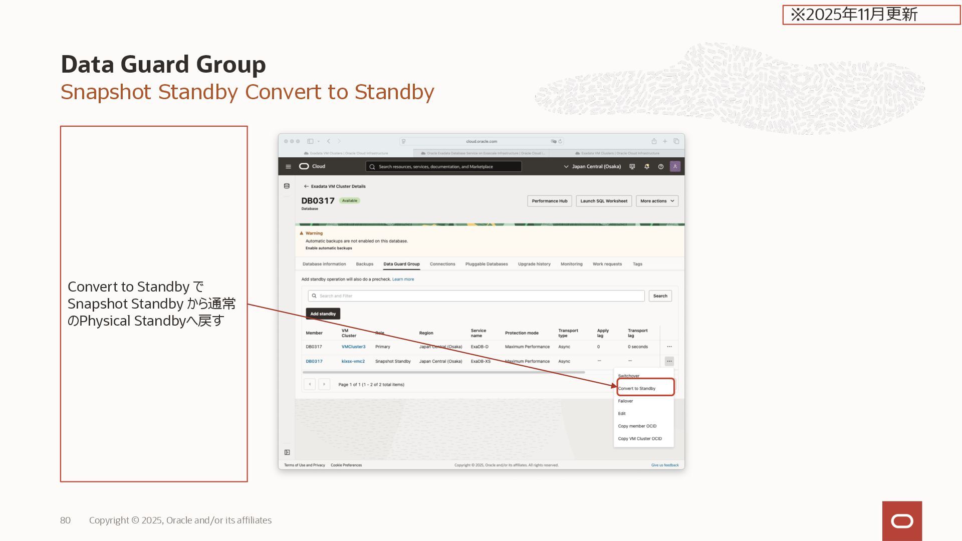 to Standby で Snapshot Standby から通常 のPhysical Standbyへ戻す Copyright © 2025, Oracle and/or its affiliates 80