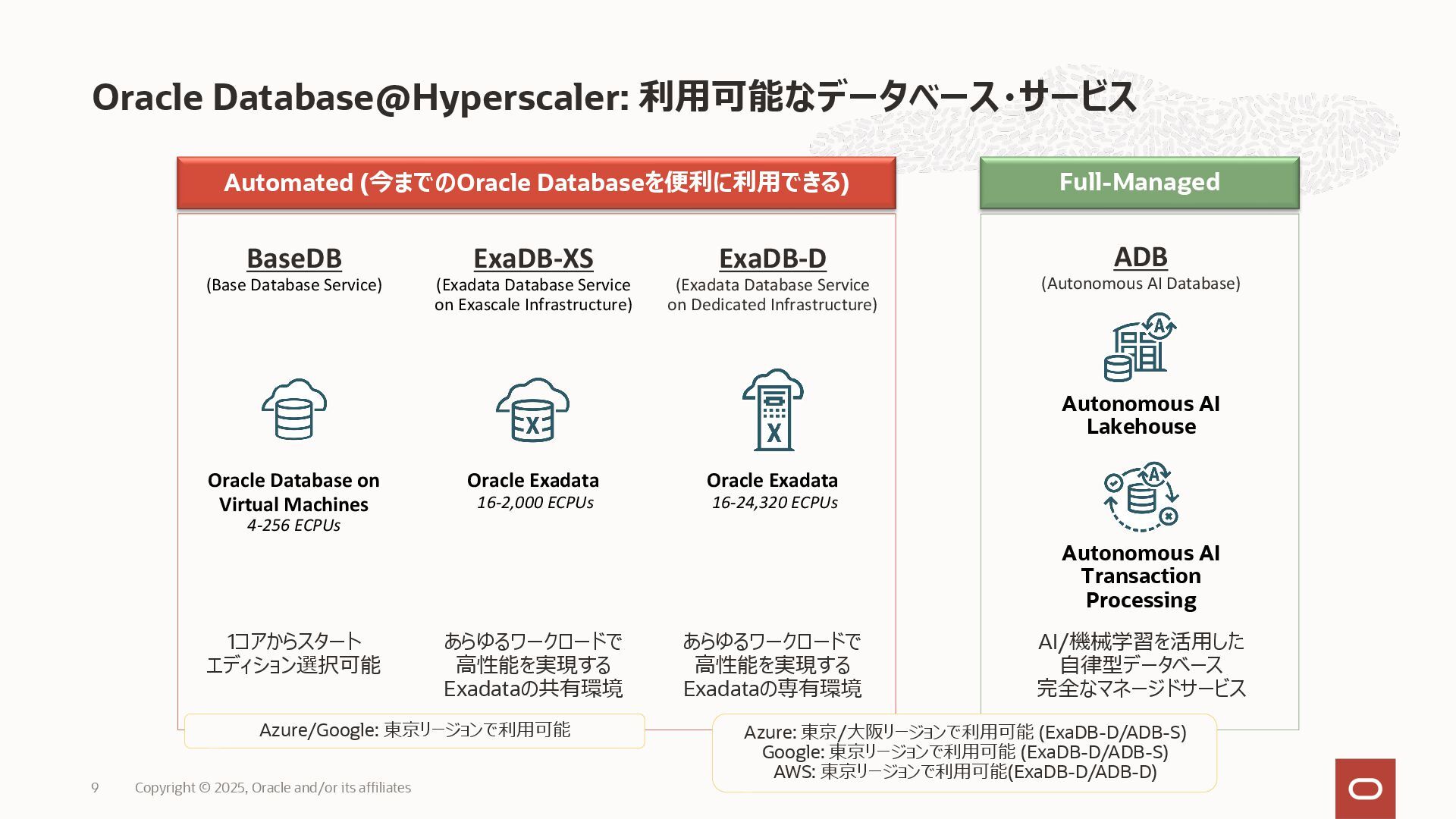 提供中(東京含む) • 提供中(東京含む) Exadata Database (Dedicated Infrastructure) • 提供中(東京/⼤阪含む) • 提供中(東京含む) • ⼤阪予定あり • 提供中(東京含む) • ⼤阪予定あり Exadata Database (Exascale Infrastructure) • 提供中(東京含む) • 提供中(東京含む) Autonomous Database (Serverless) • 提供中(東京/⼤阪含む) • 提供中(東京含む) • ⼤阪予定あり Autonomous Database (Dedicated Infrastructure) • 提供中(東京含む) • ⼤阪予定あり Base Database Service • 提供中(東京含む) • 提供中(東京含む) Zero Data Loss Autonomous Recovery Service • 提供中(東京含む) • 提供中(東京含む) • 提供中(東京含む) GoldenGate • 提供中(東京含む) • 提供予定 * Oracle Multicloud Capabilities: 各リージョンで提供されているサービスを確認できます Copyright © 2025, Oracle and/or its affiliates 8 Oracle Database@xxxはAzure東⽇本/⻄⽇本, Google Cloud東京, AWS東京でご利⽤いただけます Google Cloud⼤阪, AWS⼤阪は今後提供予定です New New New