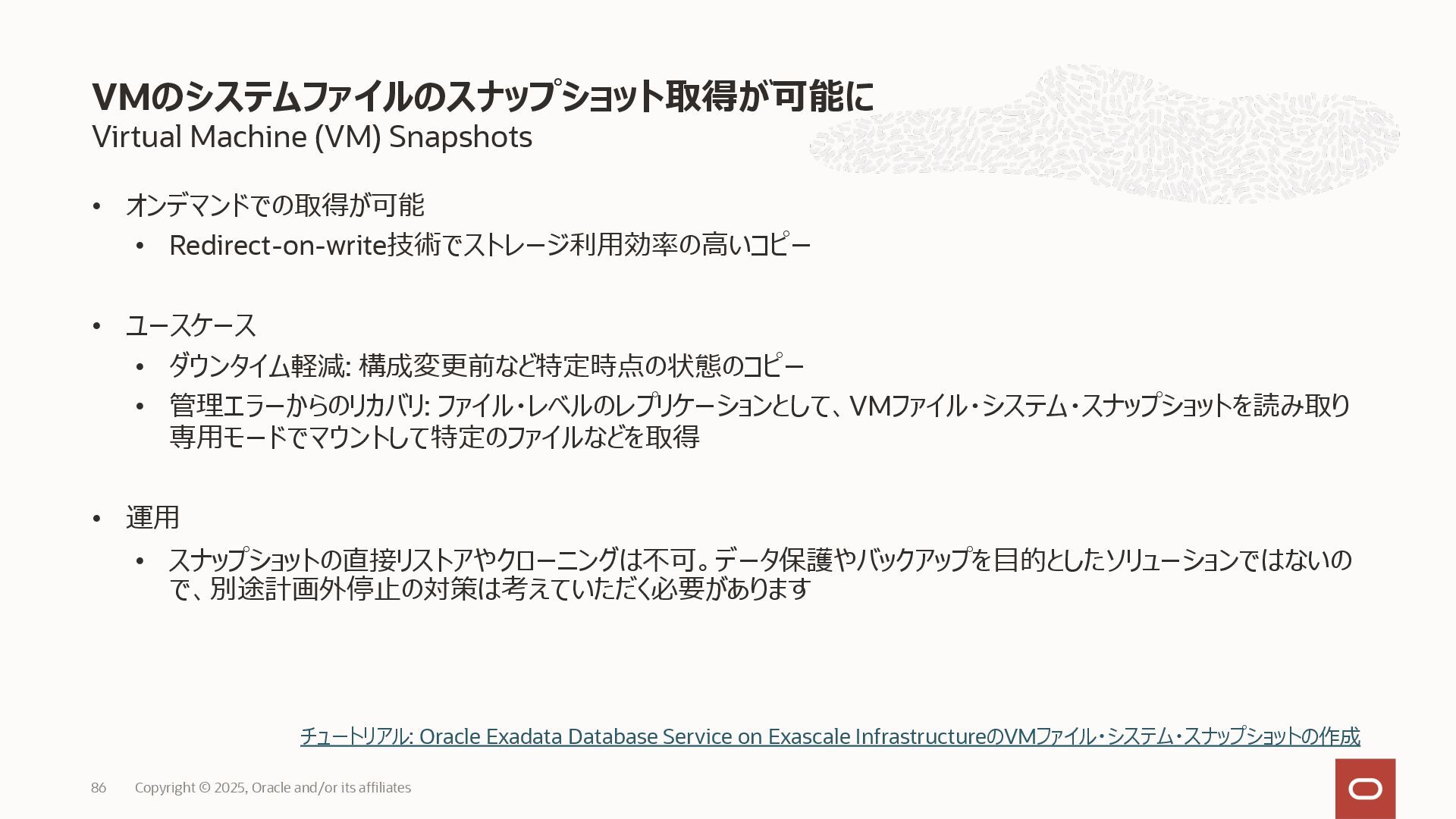 • 管理エラーからのリカバリ: ファイル・レベルのレプリケーションとして、VMファイル・システム・スナップショットを読み取り 専⽤モードでマウントして特定のファイルなどを取得 • 運⽤ • スナップショットの直接リストアやクローニングは不可。データ保護やバックアップを⽬的としたソリューションではないの で、別途計画外停⽌の対策は考えていただく必要があります 86 Copyright © 2025, Oracle and/or its affiliates Virtual Machine (VM) Snapshots チュートリアル: Oracle Exadata Database Service on Exascale InfrastructureのVMファイル・システム・スナップショットの作成