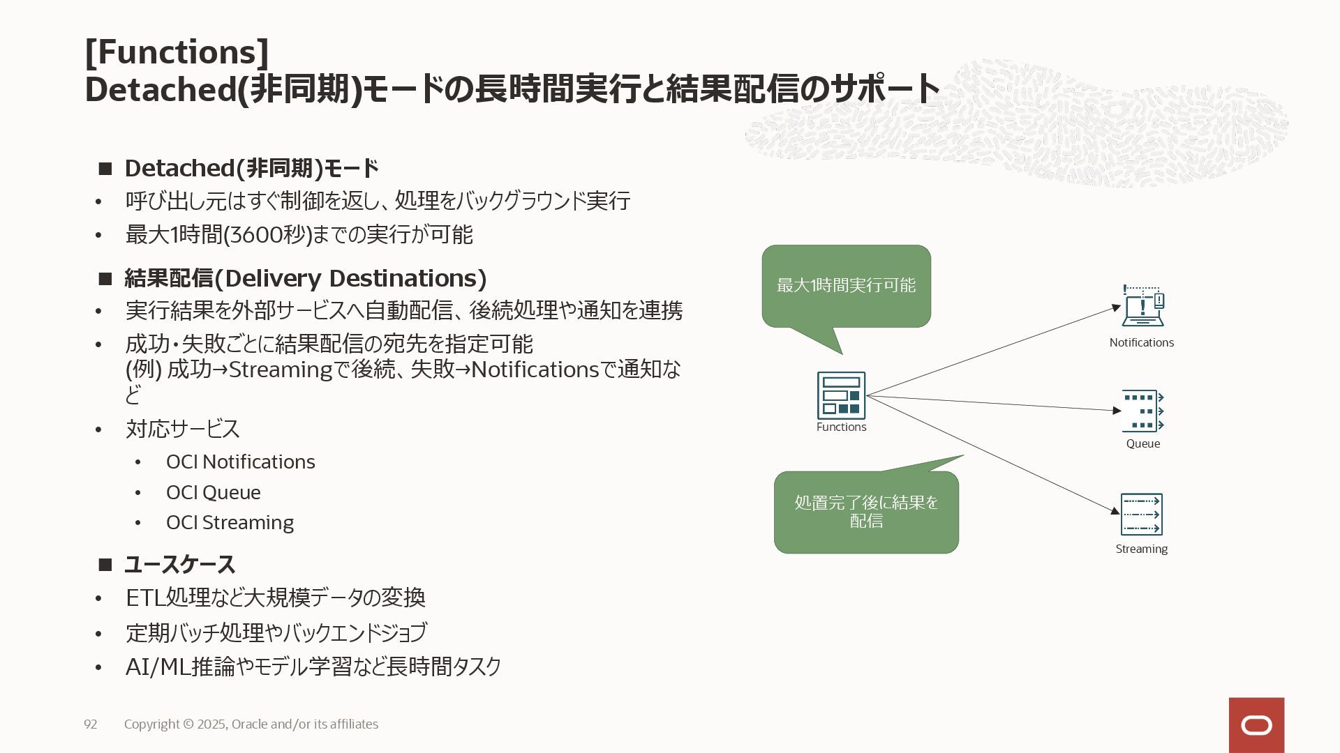 Destinations) • 実⾏結果を外部サービスへ⾃動配信、後続処理や通知を連携 • 成功・失敗ごとに結果配信の宛先を指定可能 (例) 成功→Streamingで後続、失敗→Notificationsで通知な ど • 対応サービス • OCI Notifications • OCI Queue • OCI Streaming ▪ ユースケース • ETL処理など⼤規模データの変換 • 定期バッチ処理やバックエンドジョブ • AI/ML推論やモデル学習など⻑時間タスク Functions 最⼤1時間実⾏可能 Notifications Streaming Queue 処置完了後に結果を 配信 Copyright © 2025, Oracle and/or its affiliates 92