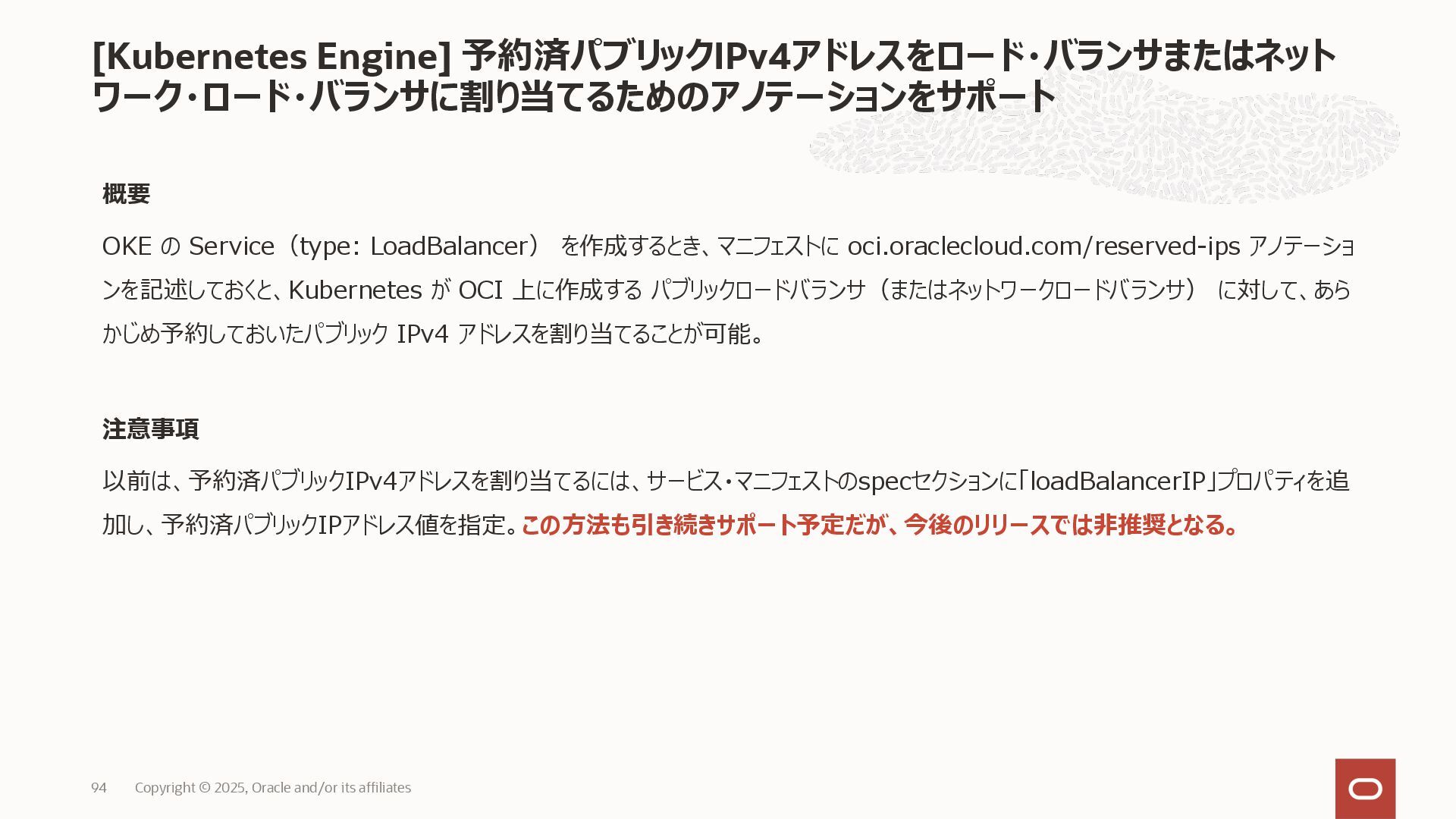 oci.oraclecloud.com/reserved-ips アノテーショ ンを記述しておくと、Kubernetes が OCI 上に作成する パブリックロードバランサ(またはネットワークロードバランサ) に対して、あら かじめ予約しておいたパブリック IPv4 アドレスを割り当てることが可能。 注意事項 以前は、予約済パブリックIPv4アドレスを割り当てるには、サービス・マニフェストのspecセクションに「loadBalancerIP」プロパティを追 加し、予約済パブリックIPアドレス値を指定。この⽅法も引き続きサポート予定だが、今後のリリースでは⾮推奨となる。 Copyright © 2025, Oracle and/or its affiliates 94