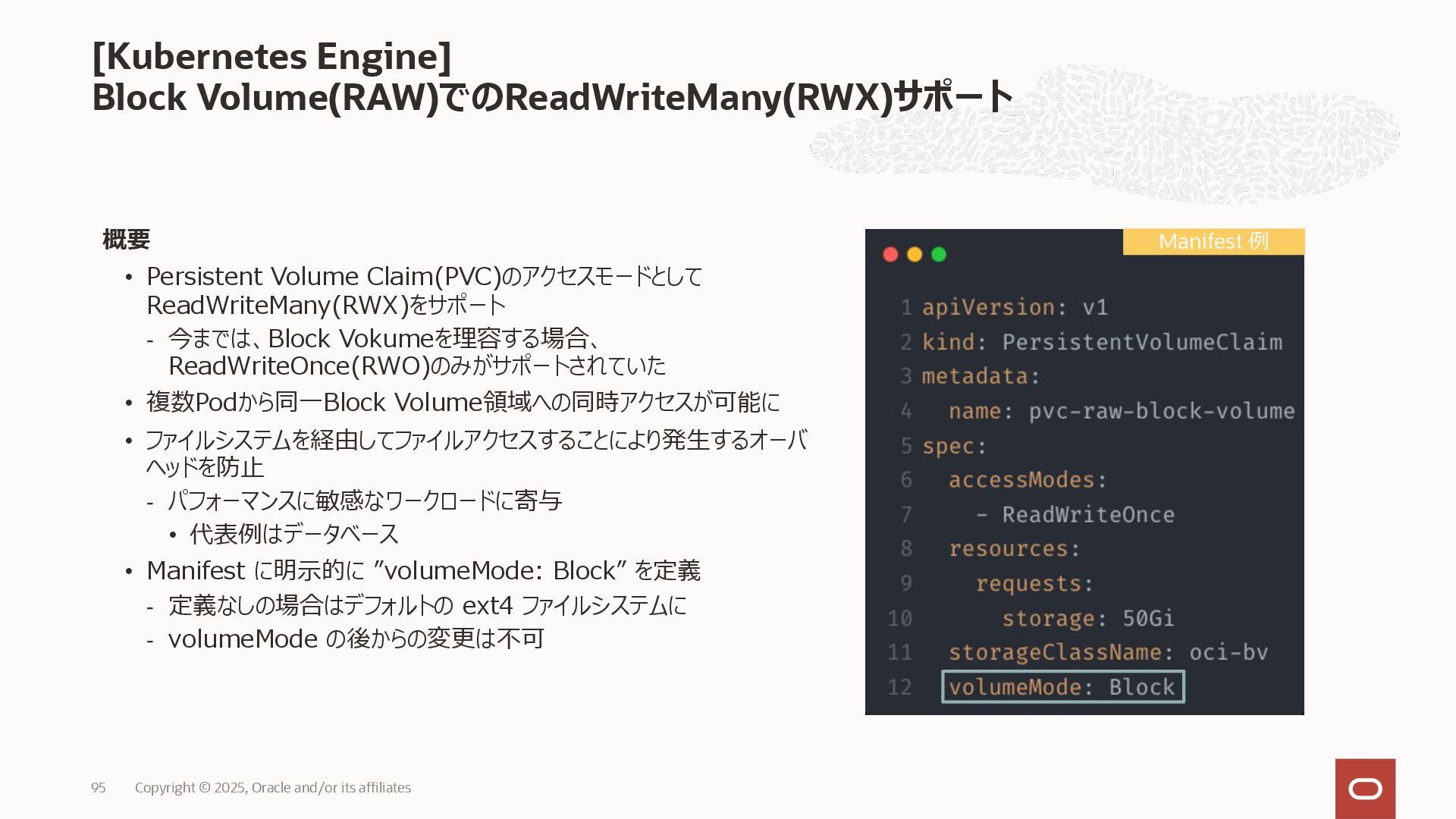 - 今までは、Block Vokumeを理容する場合、 ReadWriteOnce(RWO)のみがサポートされていた • 複数Podから同⼀Block Volume領域への同時アクセスが可能に • ファイルシステムを経由してファイルアクセスすることにより発⽣するオーバ ヘッドを防⽌ - パフォーマンスに敏感なワークロードに寄与 • 代表例はデータベース • Manifest に明⽰的に ”volumeMode: Block” を定義 - 定義なしの場合はデフォルトの ext4 ファイルシステムに - volumeMode の後からの変更は不可 Manifest 例 Copyright © 2025, Oracle and/or its affiliates 95