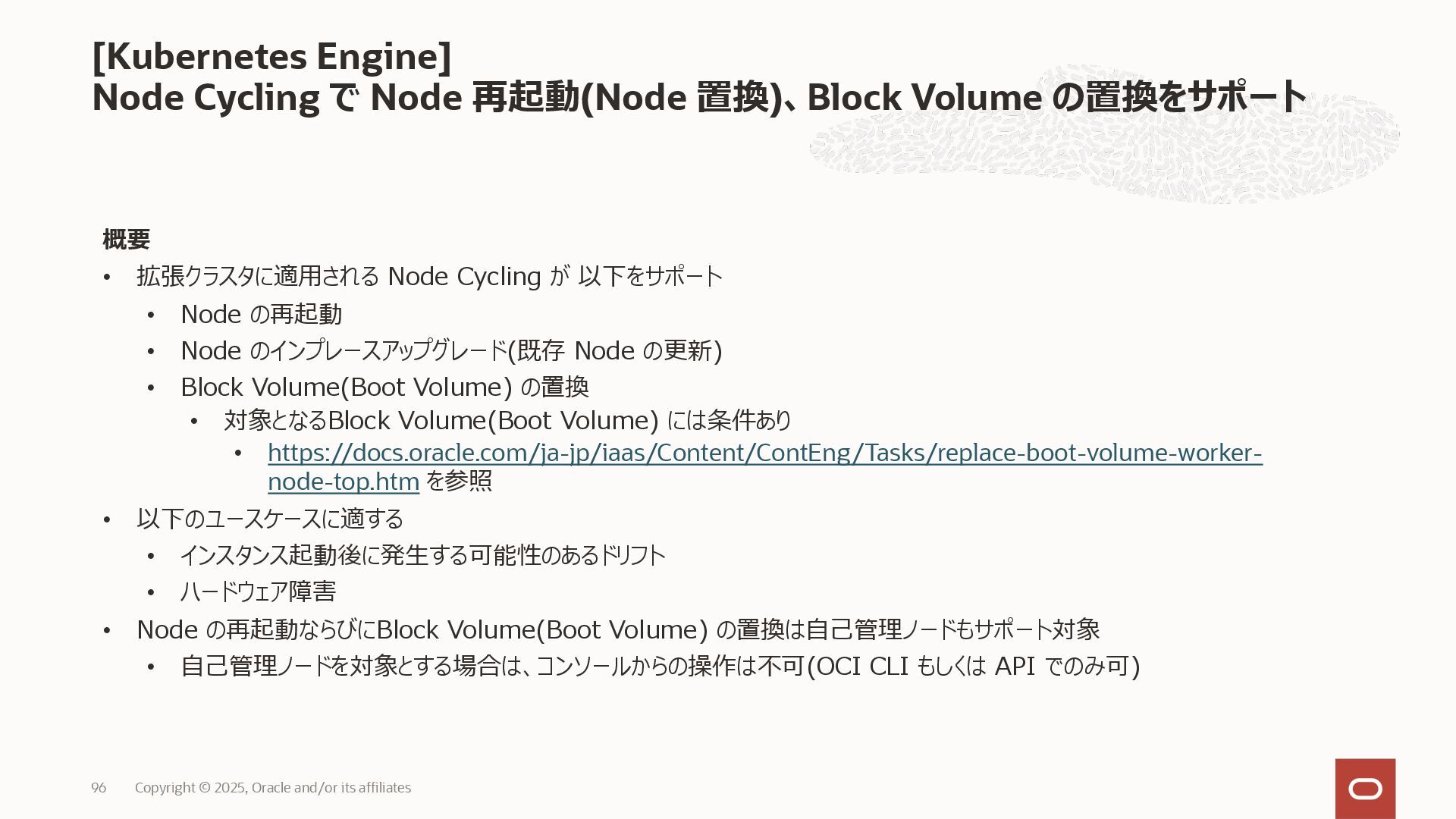 概要 • 拡張クラスタに適⽤される Node Cycling が 以下をサポート • Node の再起動 • Node のインプレースアップグレード(既存 Node の更新) • Block Volume(Boot Volume) の置換 • 対象となるBlock Volume(Boot Volume) には条件あり • https://docs.oracle.com/ja-jp/iaas/Content/ContEng/Tasks/replace-boot-volume-worker- node-top.htm を参照 • 以下のユースケースに適する • インスタンス起動後に発⽣する可能性のあるドリフト • ハードウェア障害 • Node の再起動ならびにBlock Volume(Boot Volume) の置換は⾃⼰管理ノードもサポート対象 • ⾃⼰管理ノードを対象とする場合は、コンソールからの操作は不可(OCI CLI もしくは API でのみ可) Copyright © 2025, Oracle and/or its affiliates 96