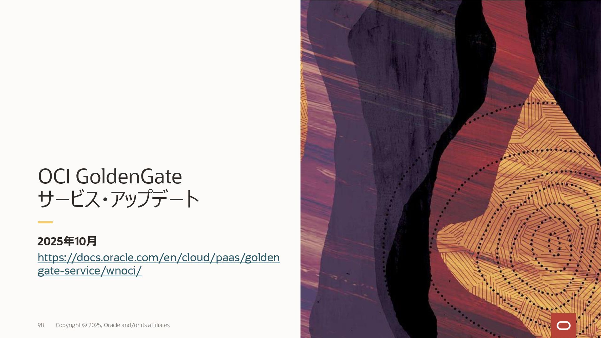 Oracle GoldenGate on Oracle Database@Azure https://blogs.oracle.com/dataintegration/how-to-provision-oci-goldengate-within-oracle- databaseazure • Part 2: Configuring Real-Time Data Replication with GoldenGate in Oracle Database@Azure https://blogs.oracle.com/dataintegration/part-2-configuring-realtime-data-replication-with- goldengate-within-oracle-databaseazure • Youtube - Oracle GoldenGate on Oracle Database@Azure https://www.youtube.com/watch?v=5lEa6ECle4w GoldenGate on Oracle Database@Azure 関連資料 Copyright © 2025, Oracle and/or its affiliates 101