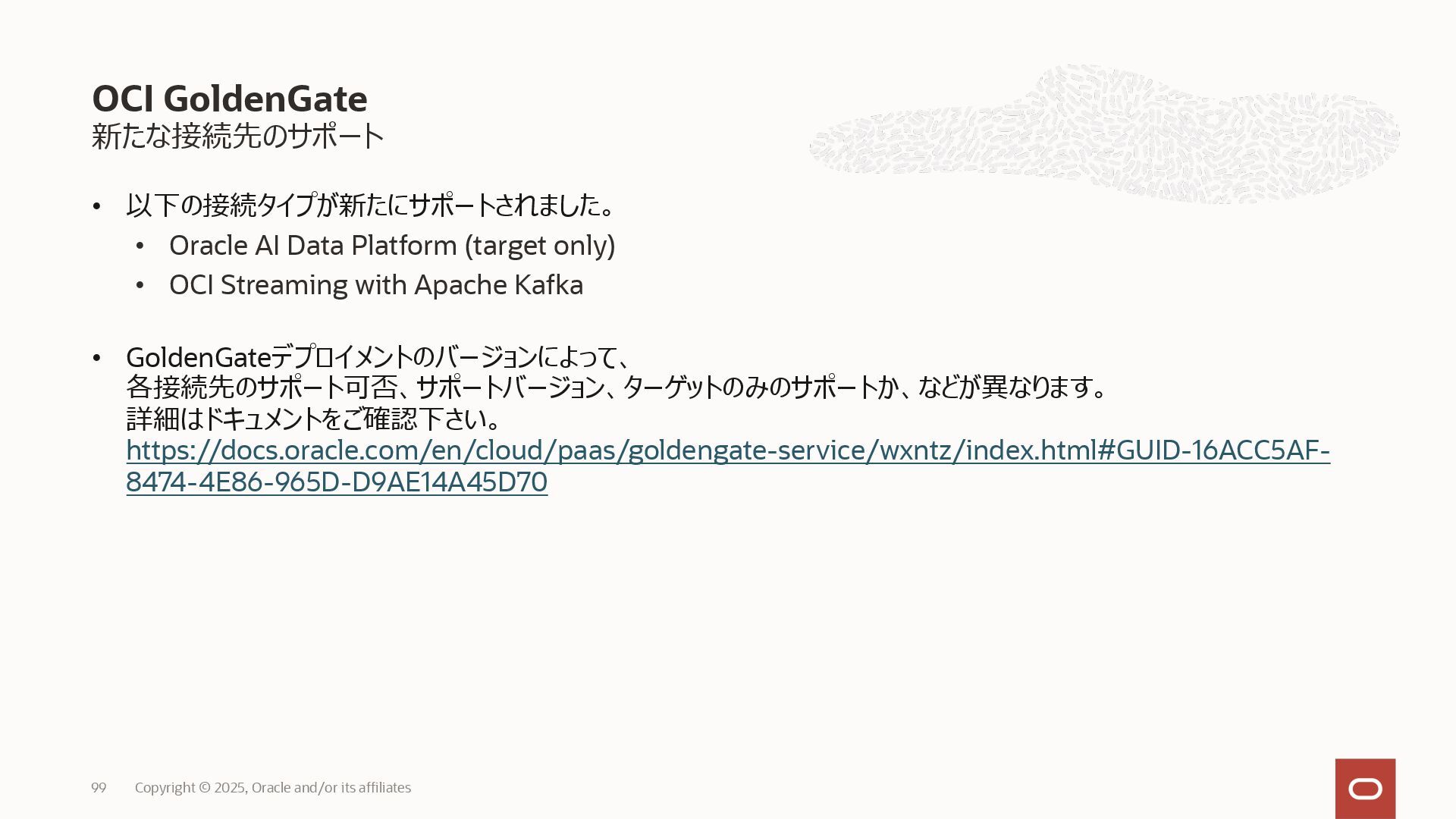 • OCI Streaming with Apache Kafka • GoldenGateデプロイメントのバージョンによって、 各接続先のサポート可否、サポートバージョン、ターゲットのみのサポートか、などが異なります。 詳細はドキュメントをご確認下さい。 https://docs.oracle.com/en/cloud/paas/goldengate-service/wxntz/index.html#GUID-16ACC5AF- 8474-4E86-965D-D9AE14A45D70 Copyright © 2025, Oracle and/or its affiliates 99 OCI GoldenGate