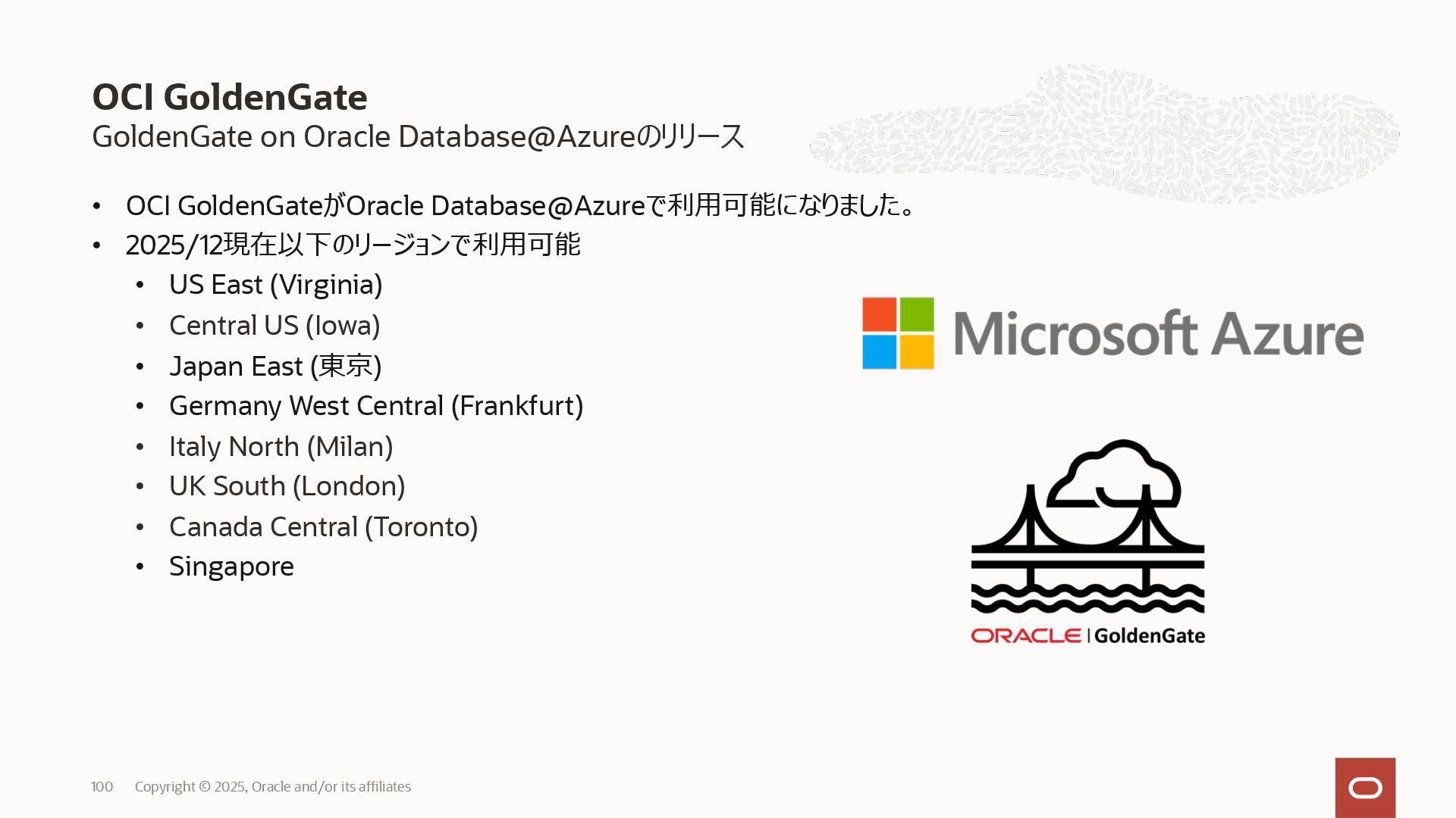 • US East (Virginia) • Central US (Iowa) • Japan East (東京) • Germany West Central (Frankfurt) • Italy North (Milan) • UK South (London) • Canada Central (Toronto) • Singapore OCI GoldenGate Copyright © 2025, Oracle and/or its affiliates 100