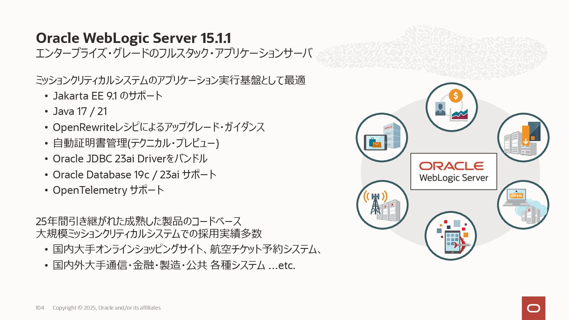 / 21 • OpenRewriteレシピによるアップグレード・ガイダンス • ⾃動証明書管理(テクニカル・プレビュー) • Oracle JDBC 23ai Driverをバンドル • Oracle Database 19c / 23ai サポート • OpenTelemetry サポート 25年間引き継がれた成熟した製品のコードベース ⼤規模ミッションクリティカルシステムでの採⽤実績多数 • 国内⼤⼿オンラインショッピングサイト、航空チケット予約システム、 • 国内外⼤⼿通信・⾦融・製造・公共 各種システム …etc. Oracle WebLogic Server 15.1.1 Copyright © 2025, Oracle and/or its affiliates 104