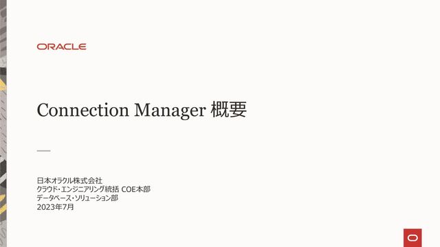 Oracle Connection Managerは Oracle Net Services の1つの機能として提供されている、セッション・レベルで動作する接続要求を転送する「プロキシ・サーバー」です。 本資料では、Connection Manager の技術的な概要から構築手順のサンプルを提示するものです。